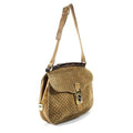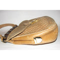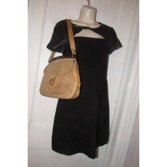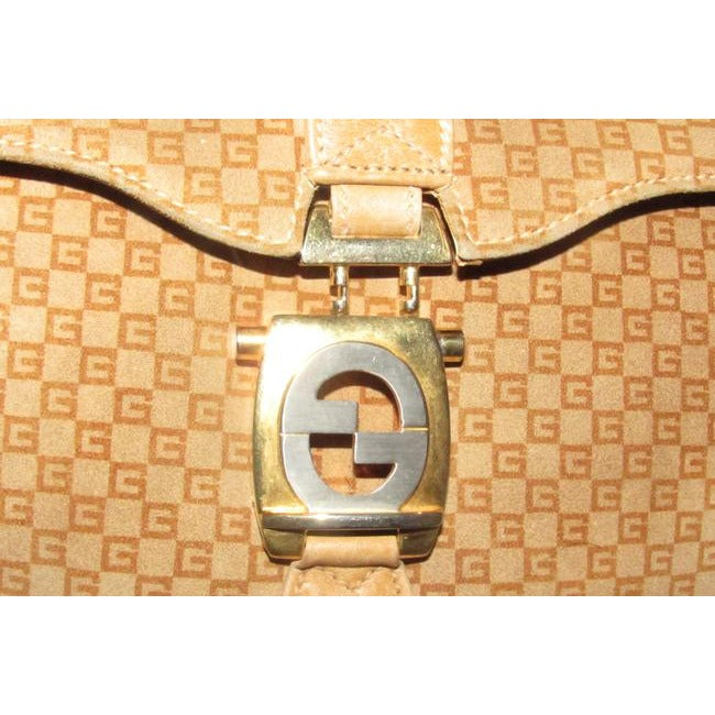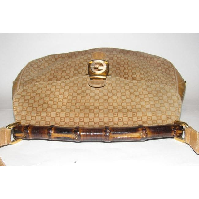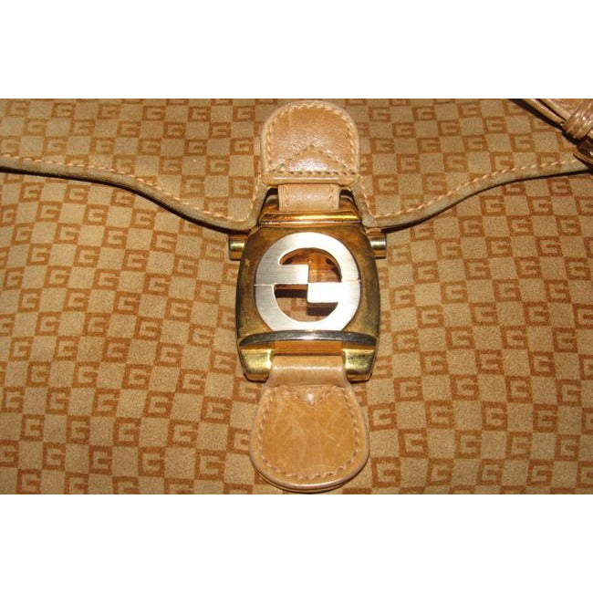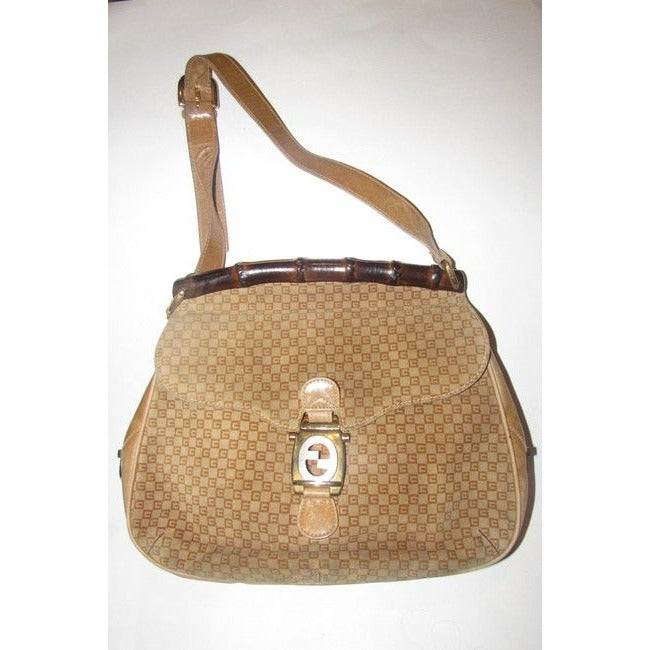 The bag is a large, bamboo top, shoulder purse. The body is made of brown small square G logo print embossed suede and leather. It is a round shape and has bold gold hardware, including great horse bit equestrian accents at the center where it closes and at the sides where the strap is attached! The purse has multiple pockets, so it can hold a lot more than you might think!
