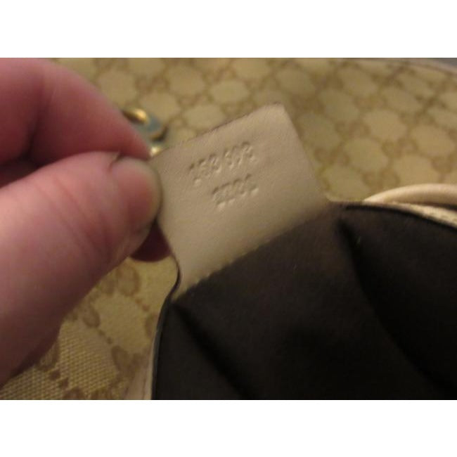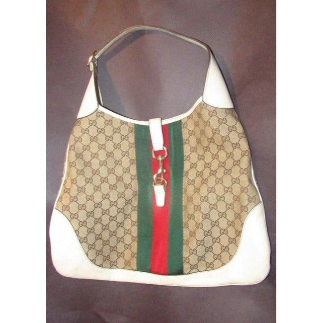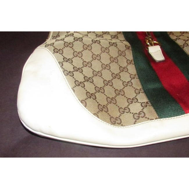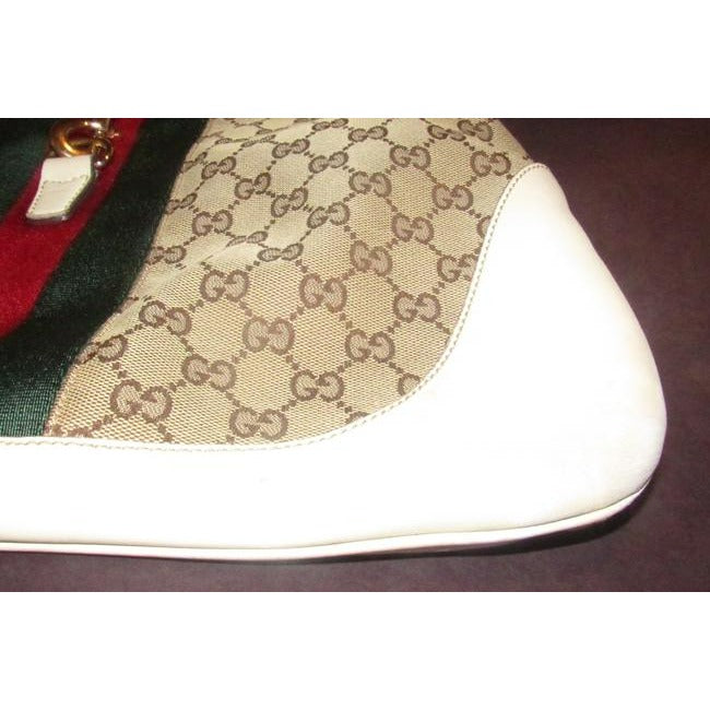 The bag is the perfect Jackie O original by Gucci that everyone wants in this color combination! The exterior is made of white leather and brown large G logo print canvas with a red and green center Sherry stripe. The purse is the largest size and has triangular not rounded corners, giving it a geometric, high-end, bohemian look. It has a wide stripe in red and green with a bold, gold closure and accents!
