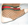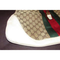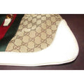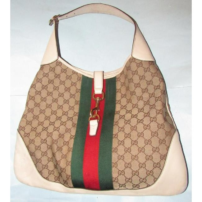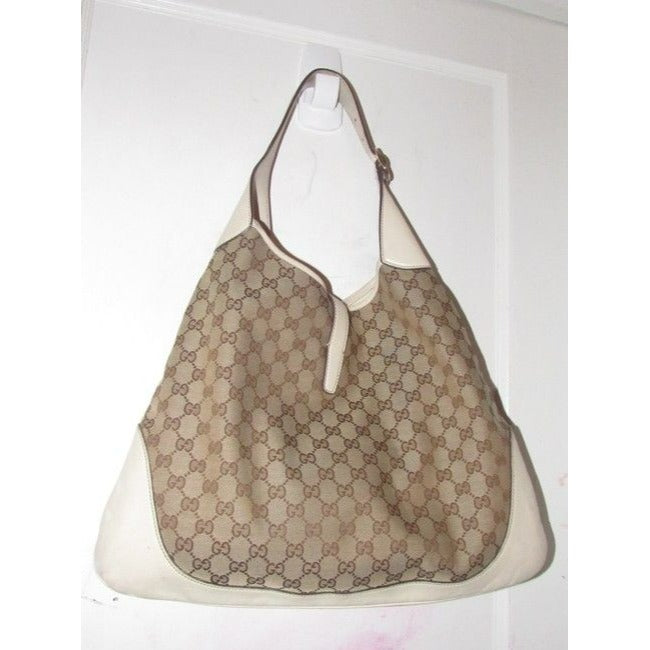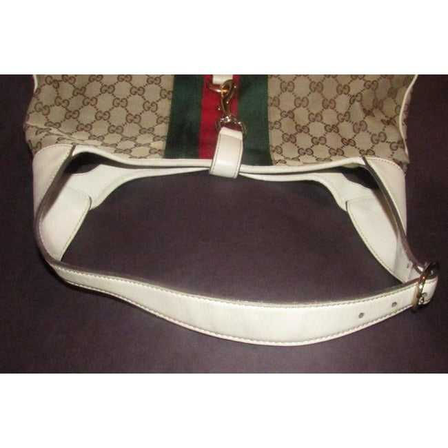 For sale is an extra large, triangular shape, Gucci, Jackie- O hobo bag in white leather and brown large G logo print canvas with a red and green center Sherry stripe & gold hardware and hook closure! It is a the classic mod style from a limited edition style by Gucci in the largest size that would be great used as your signature purse!