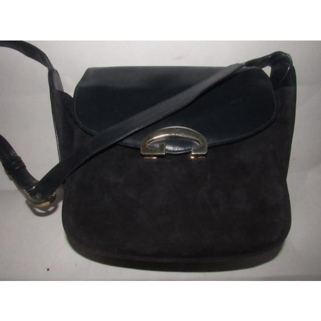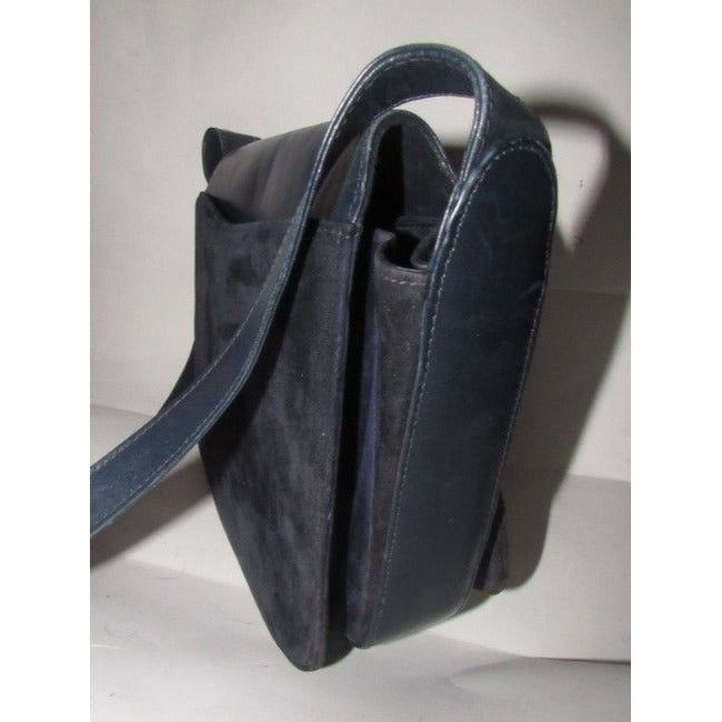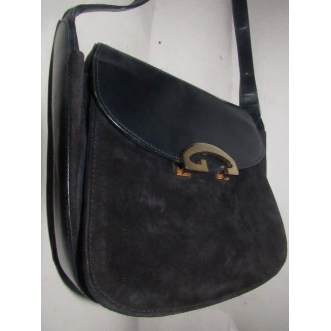 The bag is made of a navy blue glossy leather and greyish-blue suede body. It has bold gold tone 'G' accent at the front, center clasp and sides where the strap is attached! It has a shoulder strap with an envelope flap top in a saddle bag style. It has an expandable, accordion style bottom that allows it to hold more then you might think. There is an exterior pocket on the back, too.