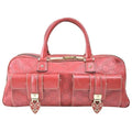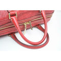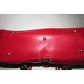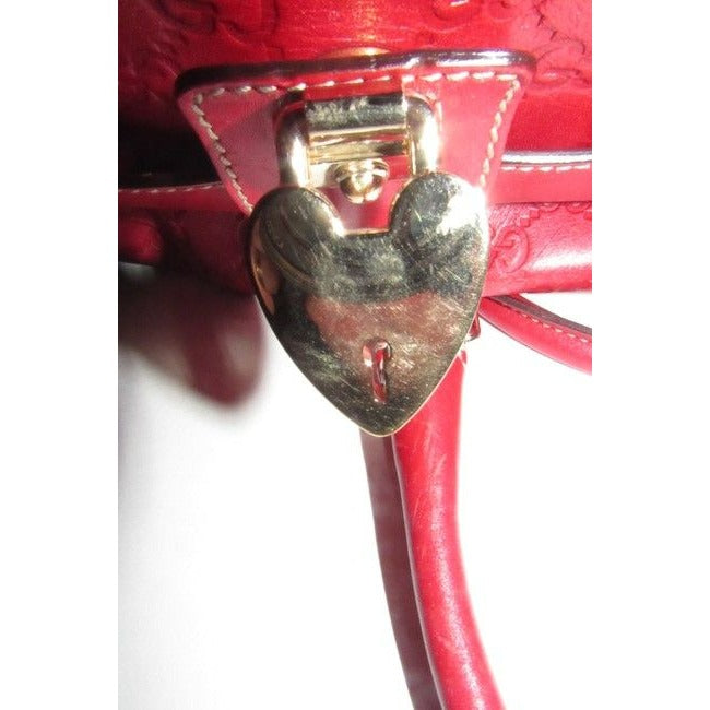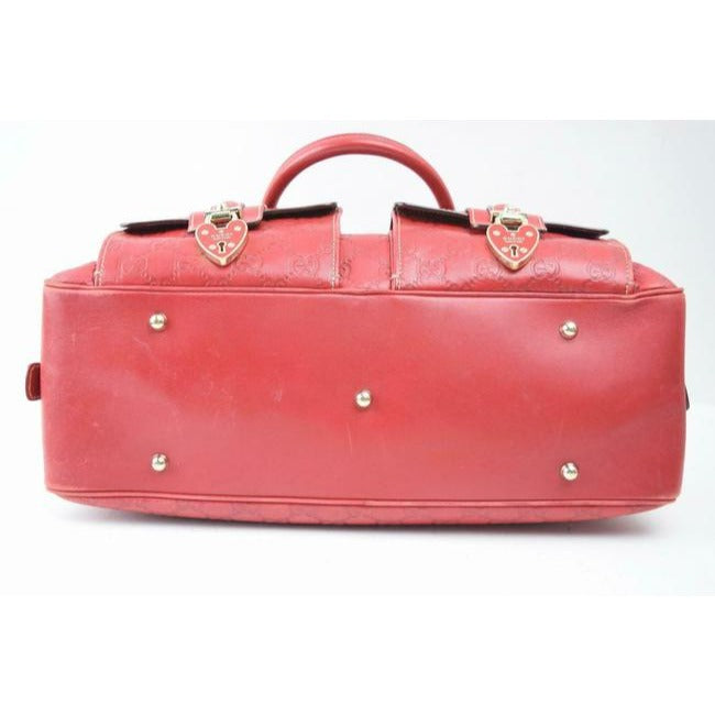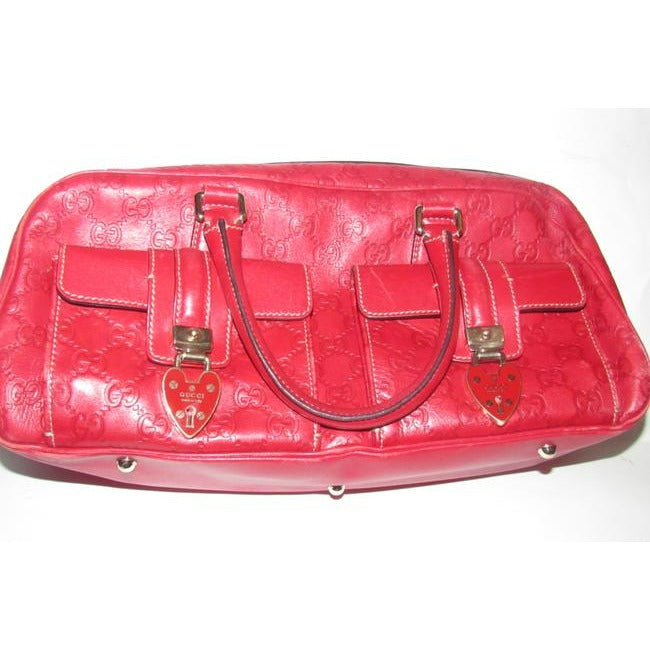 This is a limited edition style of the Joy Boston bag style satchel. This is one of the more rare versions of the classic satchel style that I believe is called the Heart Padlock. The bag is made of a red Guccissima or large 'G' logo style print embossed in leather with gold hardware and red enamel and gold heart padlock accents on the front two exterior pockets. There is dual zip closure on top and two long gold fobs attached to the zippers and it has a footed bottom. This is truly a rare find!