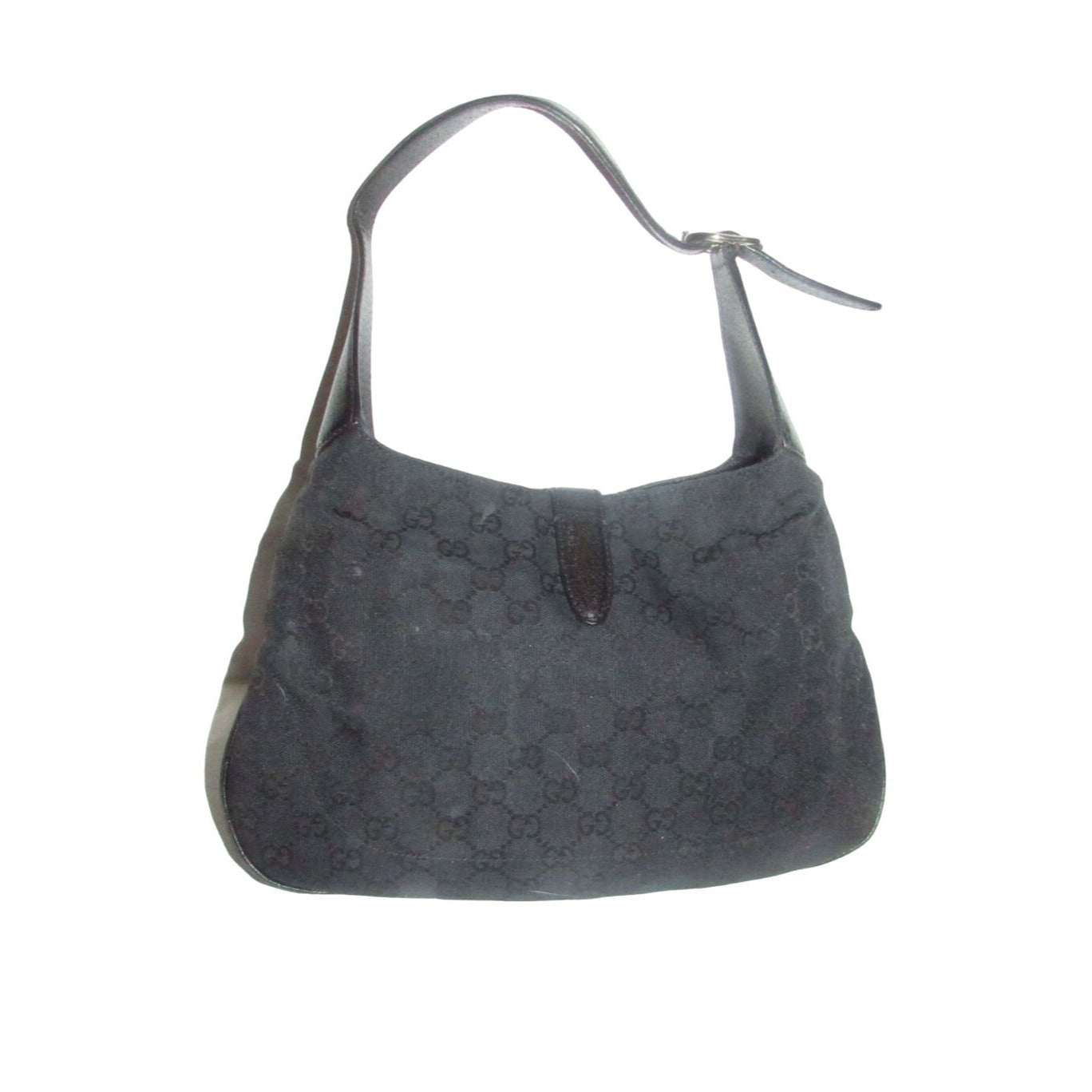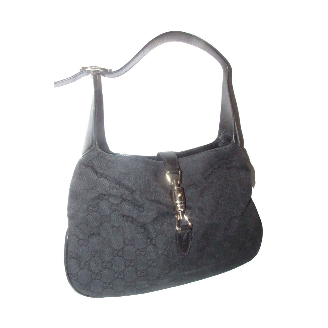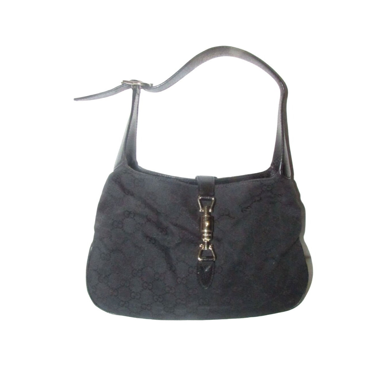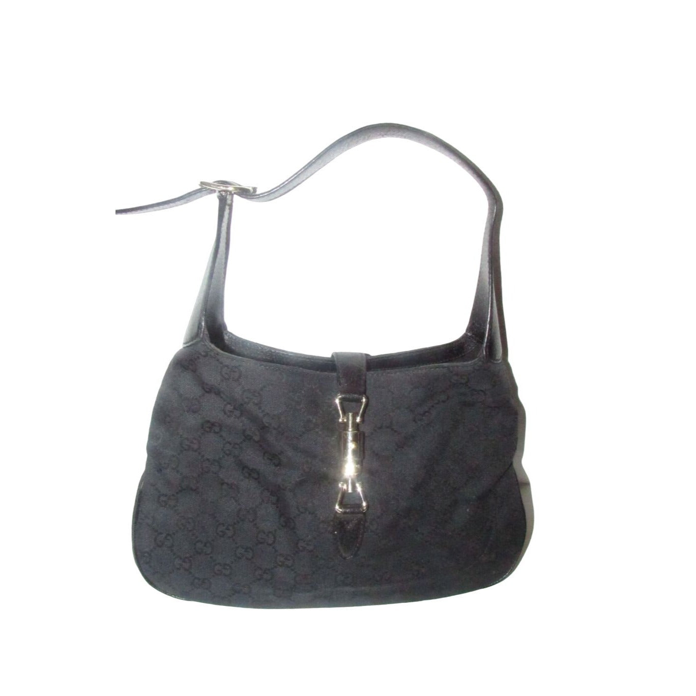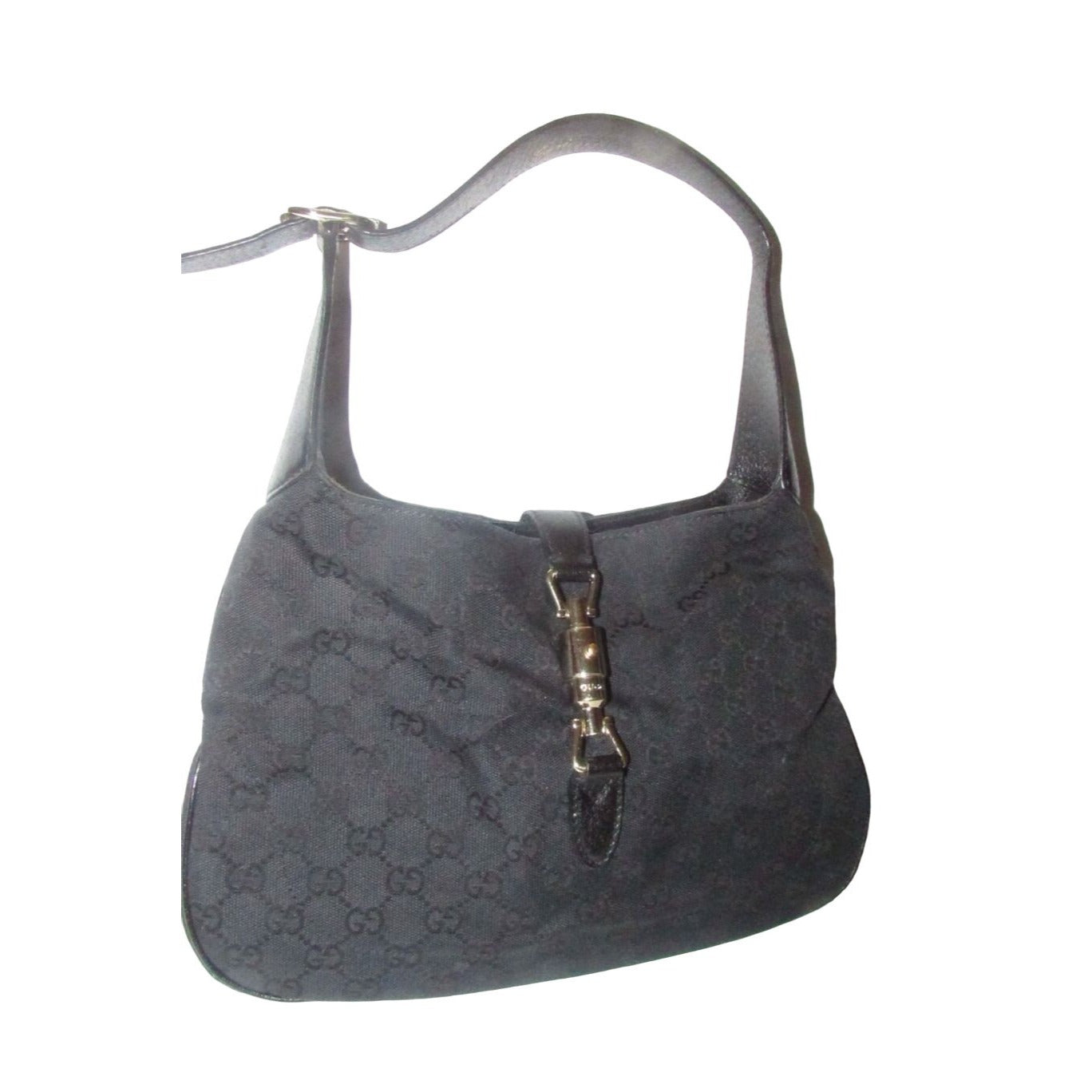 The bag is the perfect Jackie O original by Gucci one of the color combinations that everyone wants! The exterior is black fabric with the large G logo design and black leather. The purse is the largest of the sizes this style was offered in and has a chrome push button style closure!