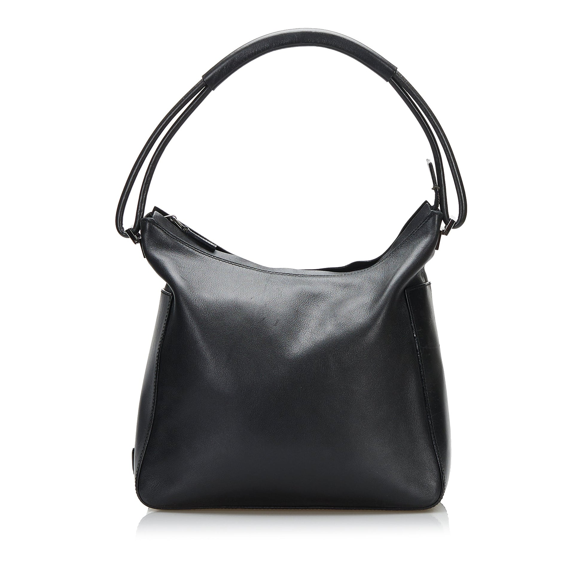 This shoulder bag features a leather body, rolled leather handles, a top zip closure, and an interior zip pocket.