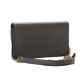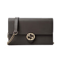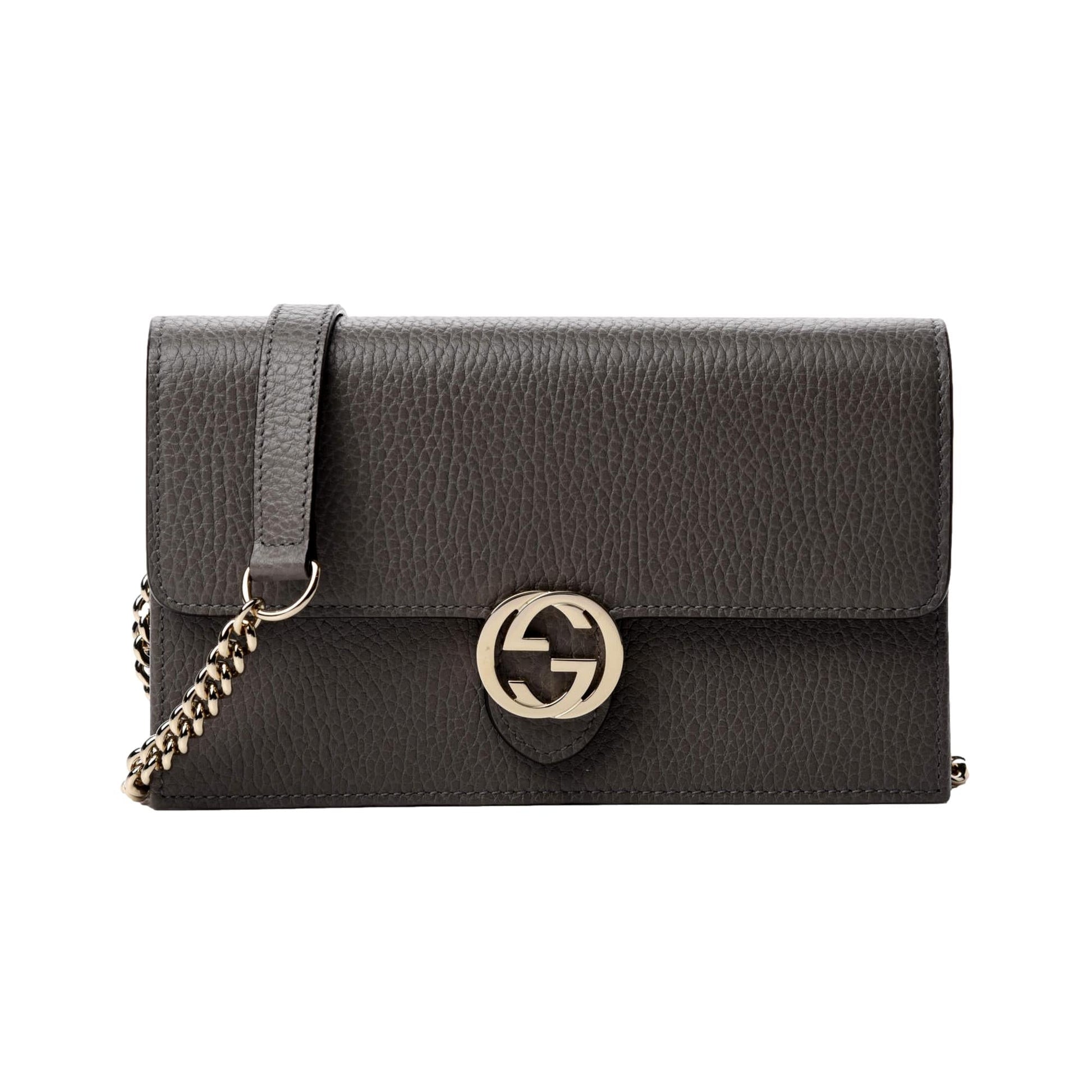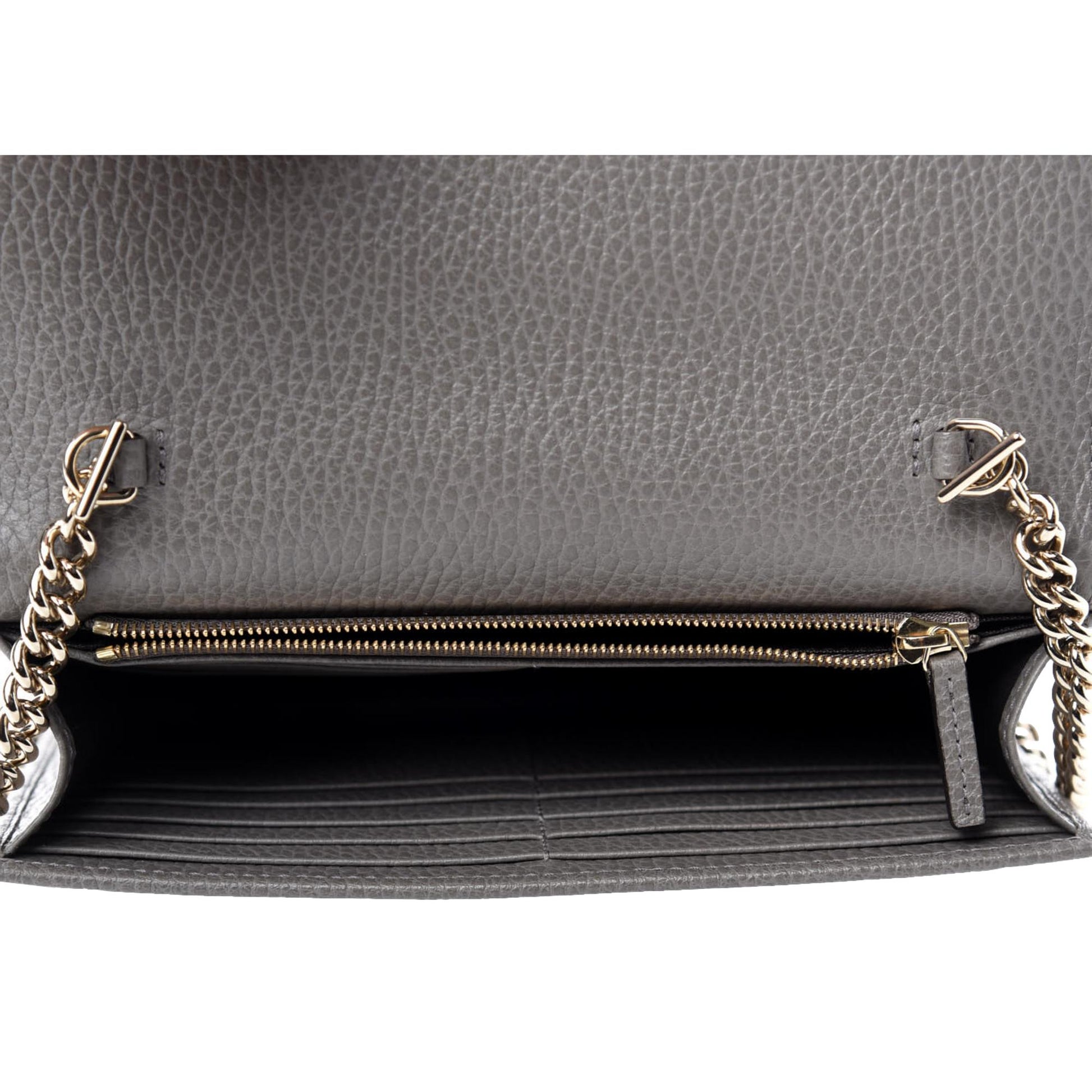 Introducing the Gucci Marmont Dollar Shoulder Bag in gray. This stylish chain wallet is crafted of textured calfskin leather and features a front flap with a polished light gold interlocking GG Gucci logo. The flap opens to a compact interior with card slots and a zipper compartment. This classic piece is perfect for any ensemble whether you are dressing up or down. Suitable for any occasion, with the distinctive quality and style, only from Gucci!
