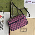 Gucci archives, various pieces throughout the collection provide a new lens through which to view the emblematic GG rhombi motif. Already an evolution of the House logo, it is once again reimagined in a series of bright colors??a theme that has become synonymous with the Creative Director??s vision. This GG Marmont small shoulder bag has an adjustable strap and is part of the GG Multicolor collection.
