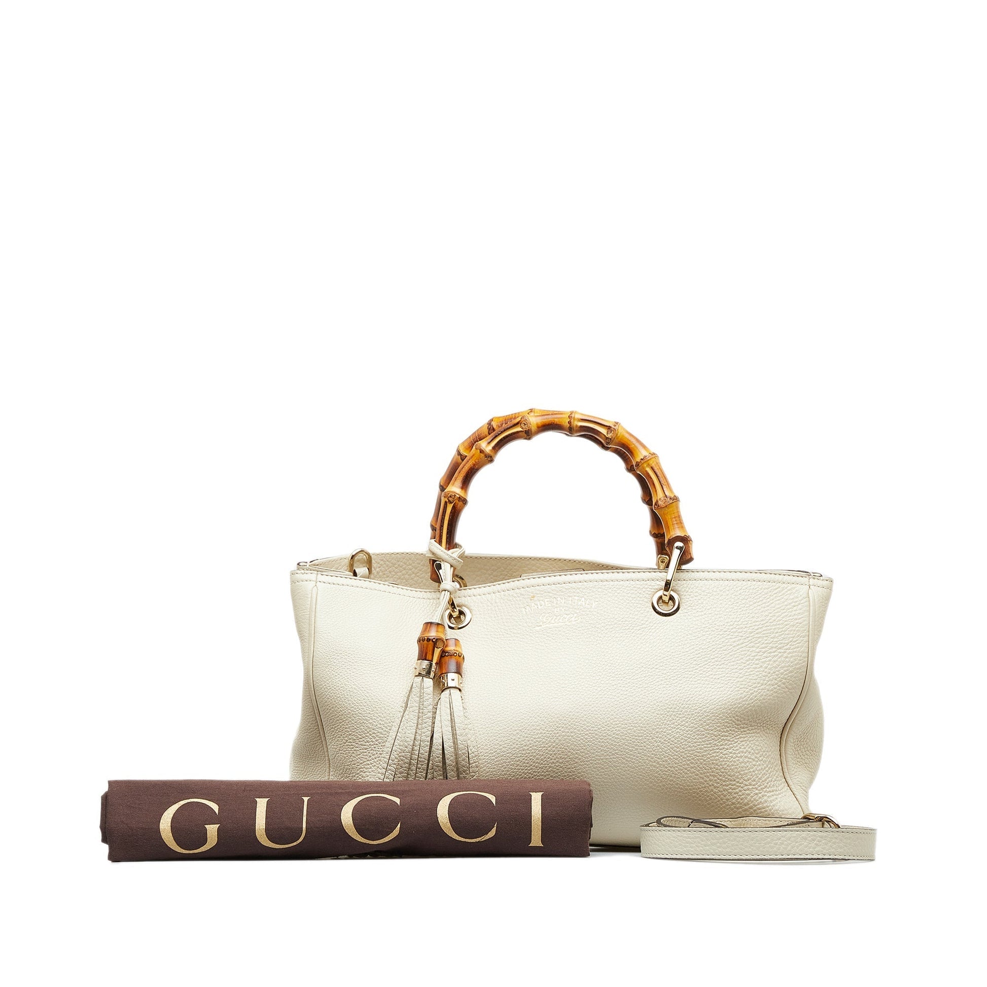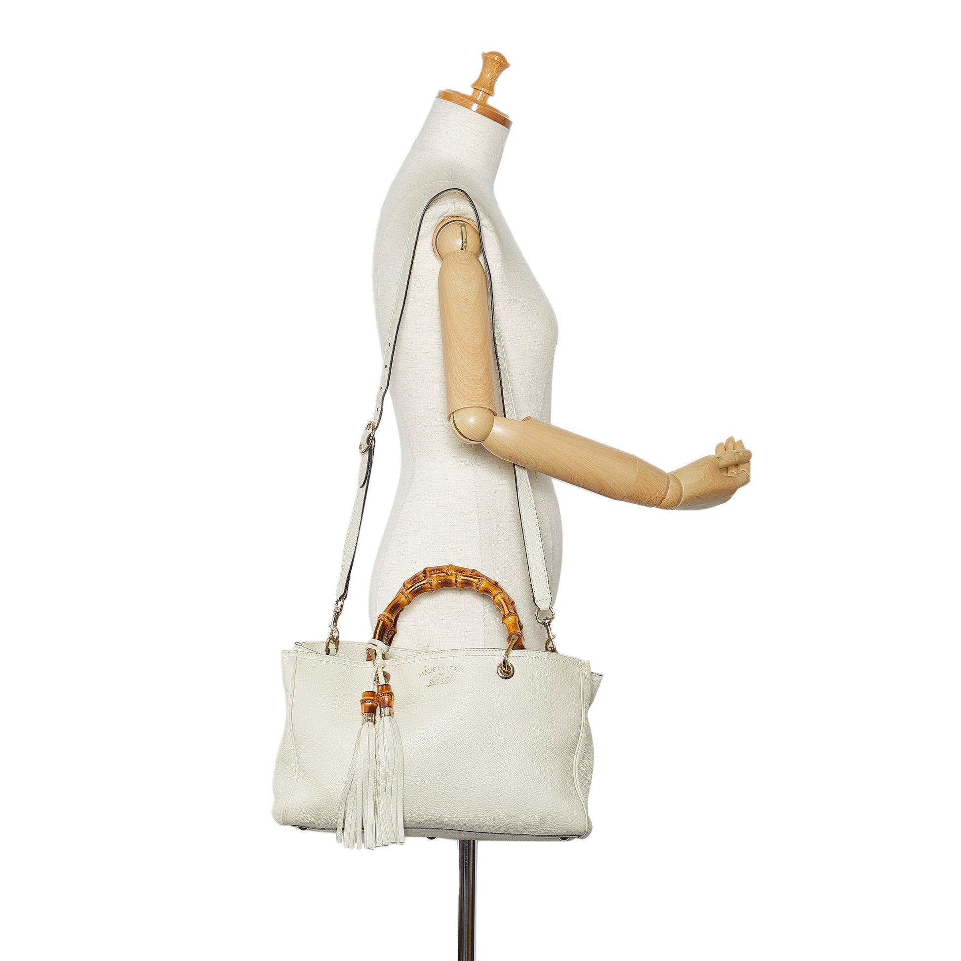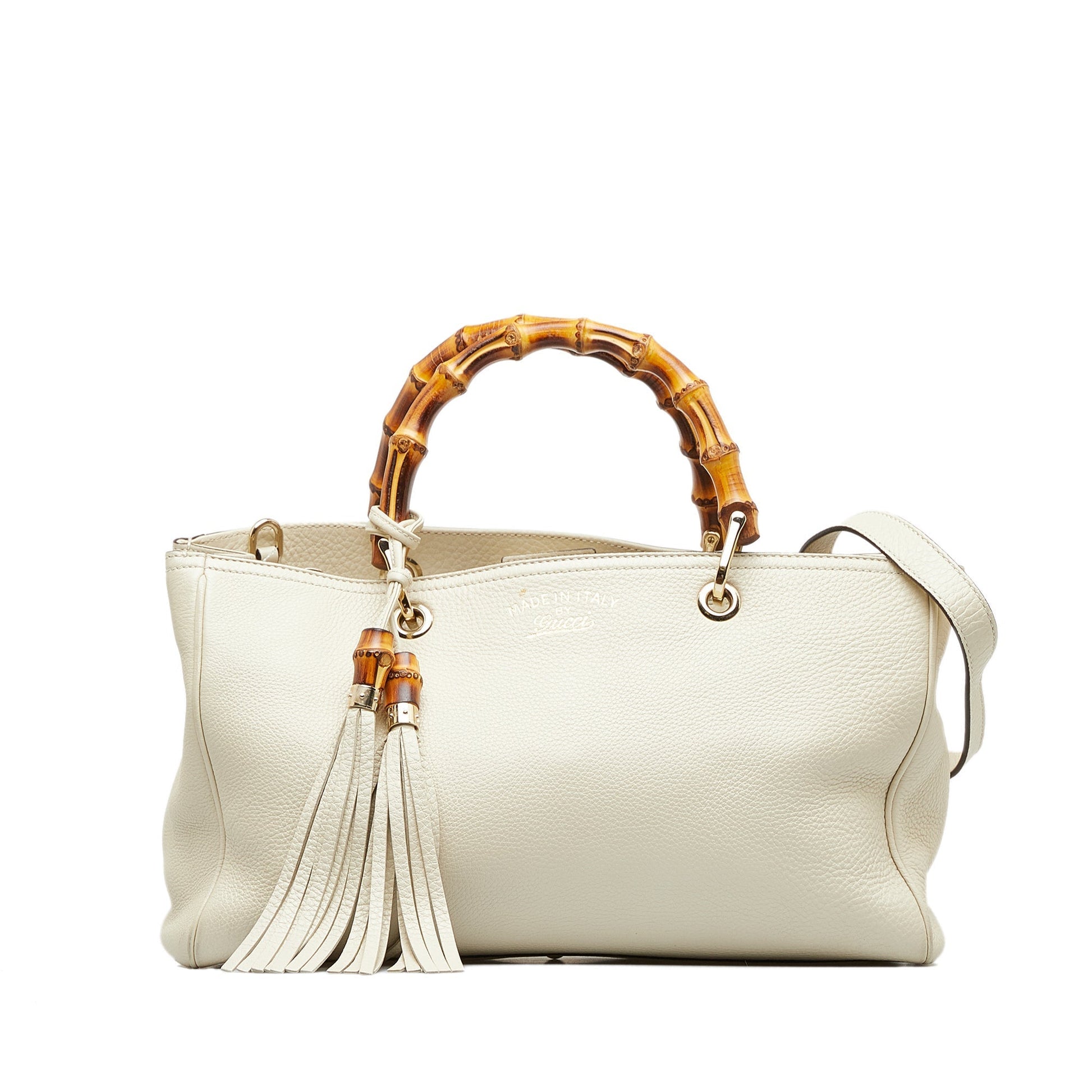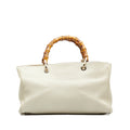 The Bamboo Shopper features a leather body, bamboo top handles, a detachable strap, an open top with magnetic snap closure, and interior zip and slip pockets. Comes with dust bag