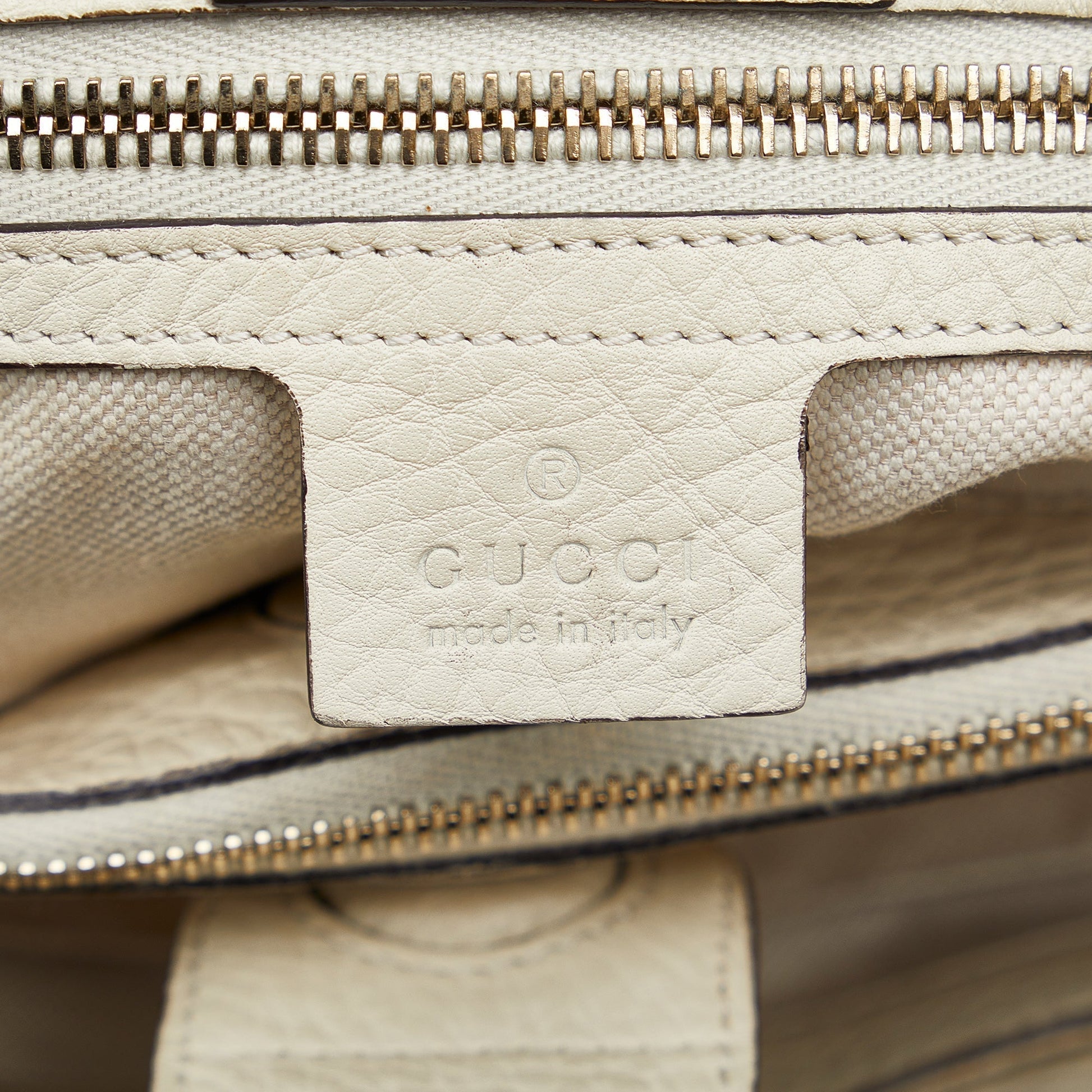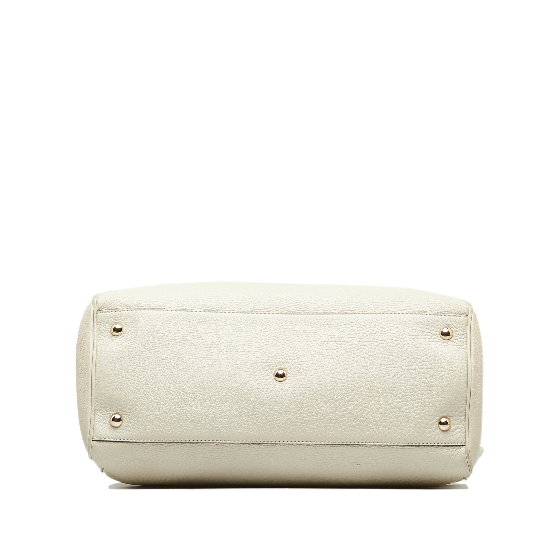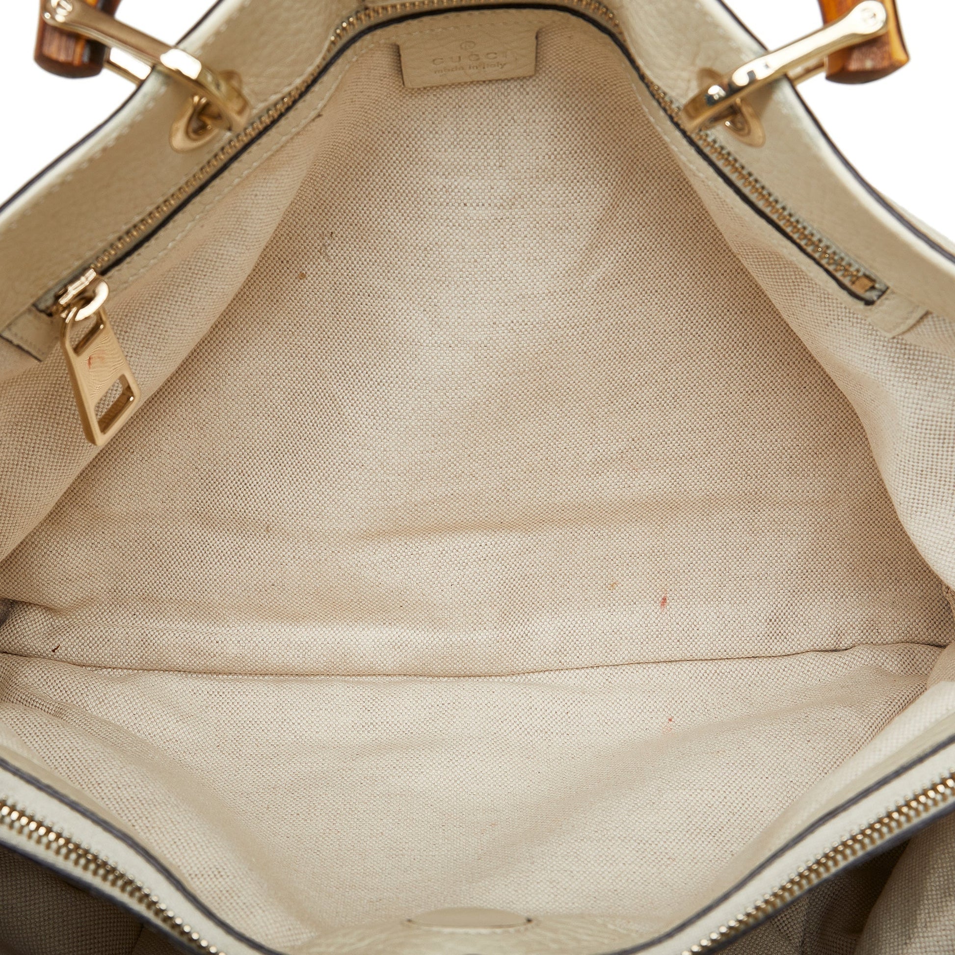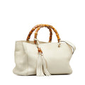 The Bamboo Shopper features a leather body, bamboo top handles, a detachable strap, an open top with magnetic snap closure, and interior zip and slip pockets. Comes with dust bag