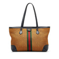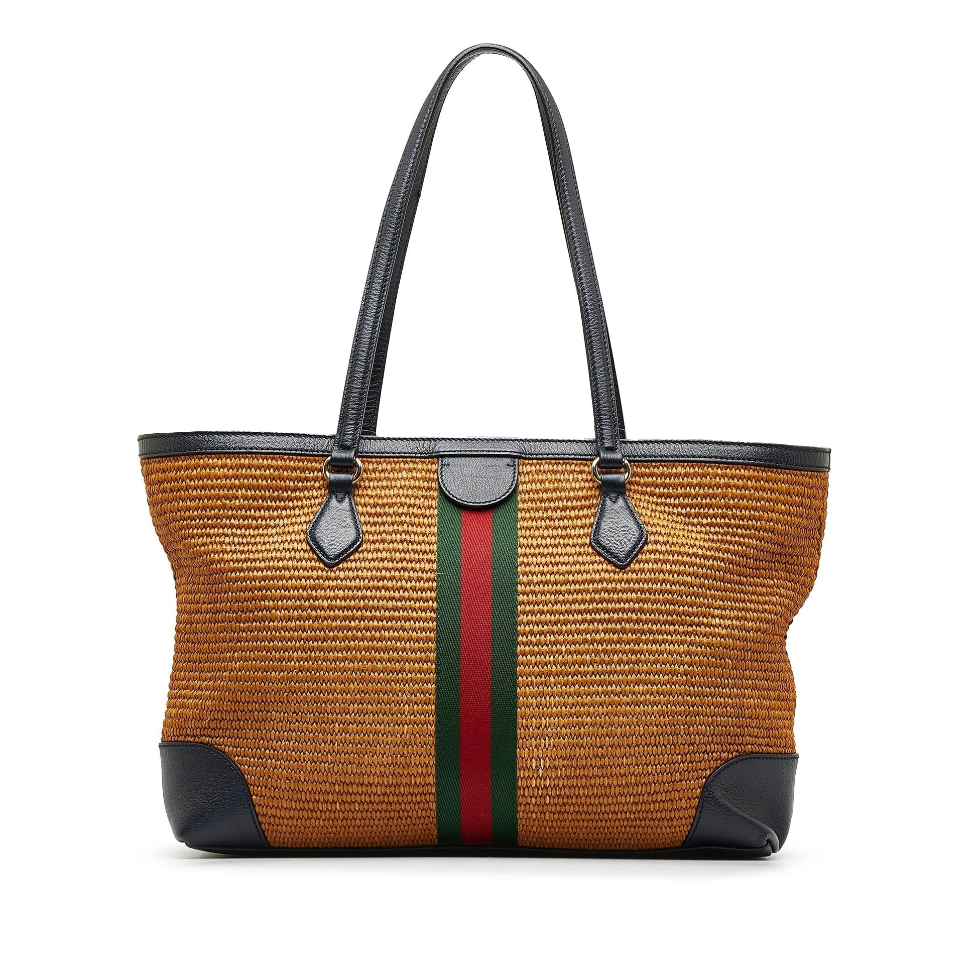 This tote bag features a raffia body with leather trim and web detail, flat leather shoulder straps, an open top with a magnetic snap button closure, and interior zip and slip pockets. Comes with dust bag