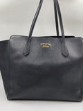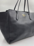 The medium Gucci Swing tote is a great everyday bag with long shoulder straps (22cm drop), roomy interior space and is made in a hard wearing textured leather. Inside the bag has a cotton lining, slip pockets for a phone, plus a zipped pocket big enough to fit an iPad. The bag is closed with a hidden magnet tab.
