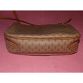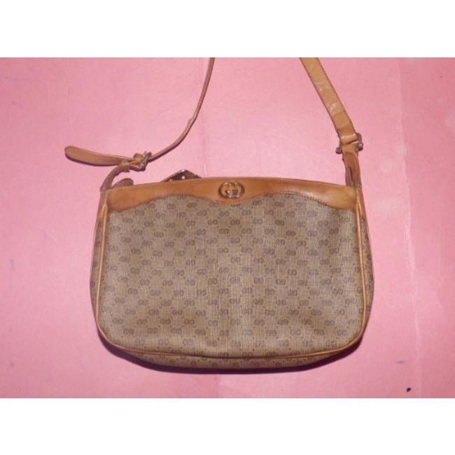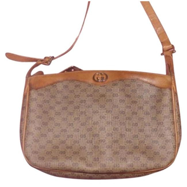You are looking at a genuine camel leather and small logo covered, coated canvas, cross body or shoulder bag by Gucci from the 1970's/80's. It is a classic, 'sling style' in a large size that can be worn as a shoulder or cross body style that is a perfect signature piece!