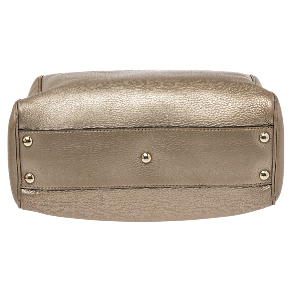 Handbags as fabulous as this one are hard to come by. So own this gorgeous Gucci tote today and light up your closet Crafted from metallic gold leather this stunning number has a spacious canvas interior and is wonderfully held by two bamboo handles which make the piece all the more worthy of being in your closet.