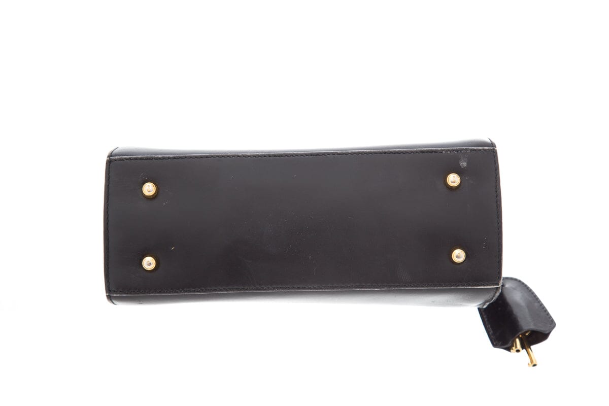 Gucci Midnight Lady Lock Leather Handbag. This item is vintage with some slight signs of wear; scuffing/creasing in leather, leather separation on flap edge, scratching on hardware, and some stains on lining.