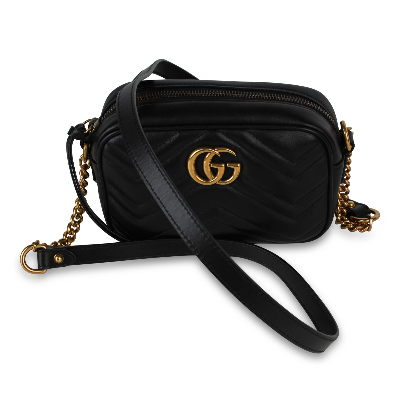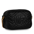 The iconic Gucci marmont collection presents this GG Marmont Mini crossbody bag in black chevron matelassé leather. Expertly crafted from Italy, the mini marmont features a petite silhouette with a soft structure, featuring the iconic double G in gold hardware. Bursting with personality, the bag also features a micro fibre suede interior in a complimenting salmon pink shade. This beautiful gem that is ideal for both the day and the evening.