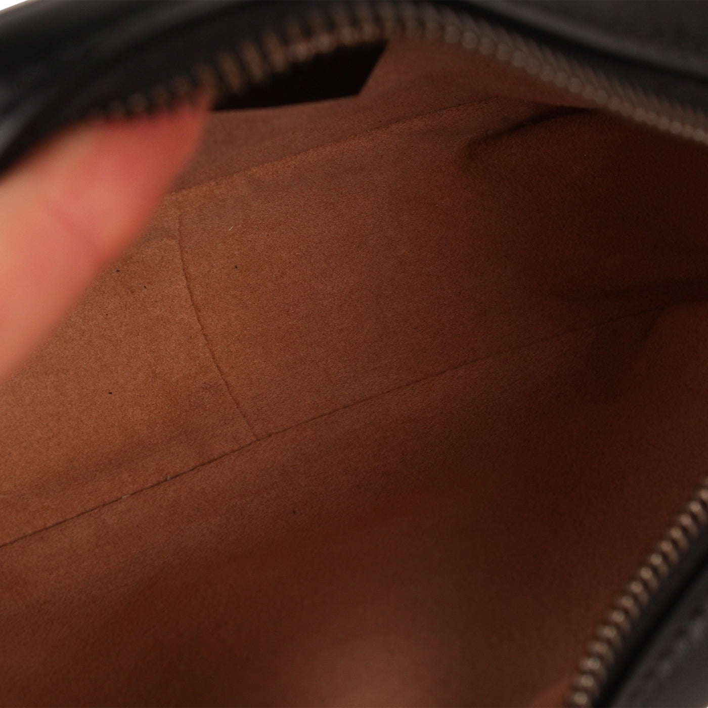 - Zip closure with leather pull tag