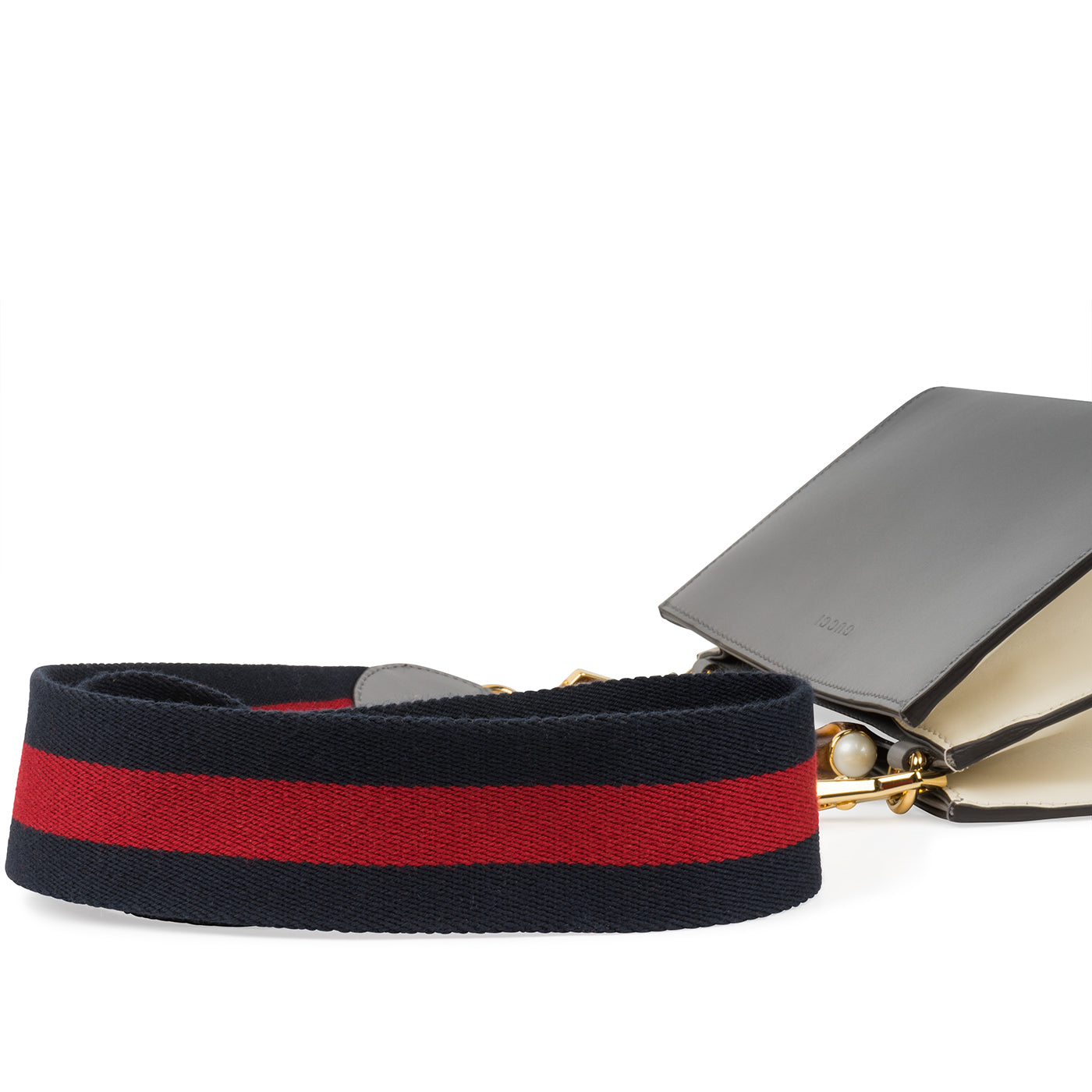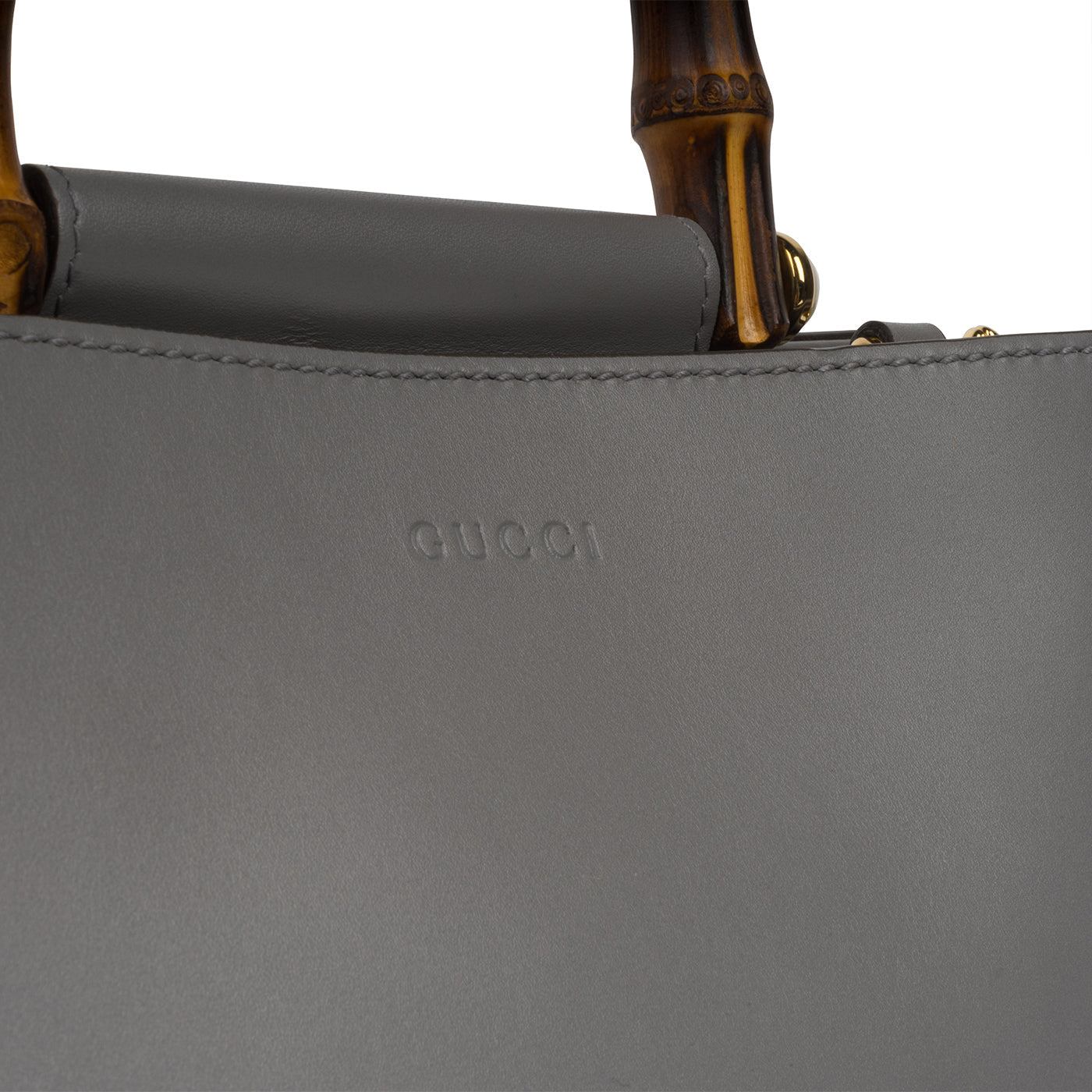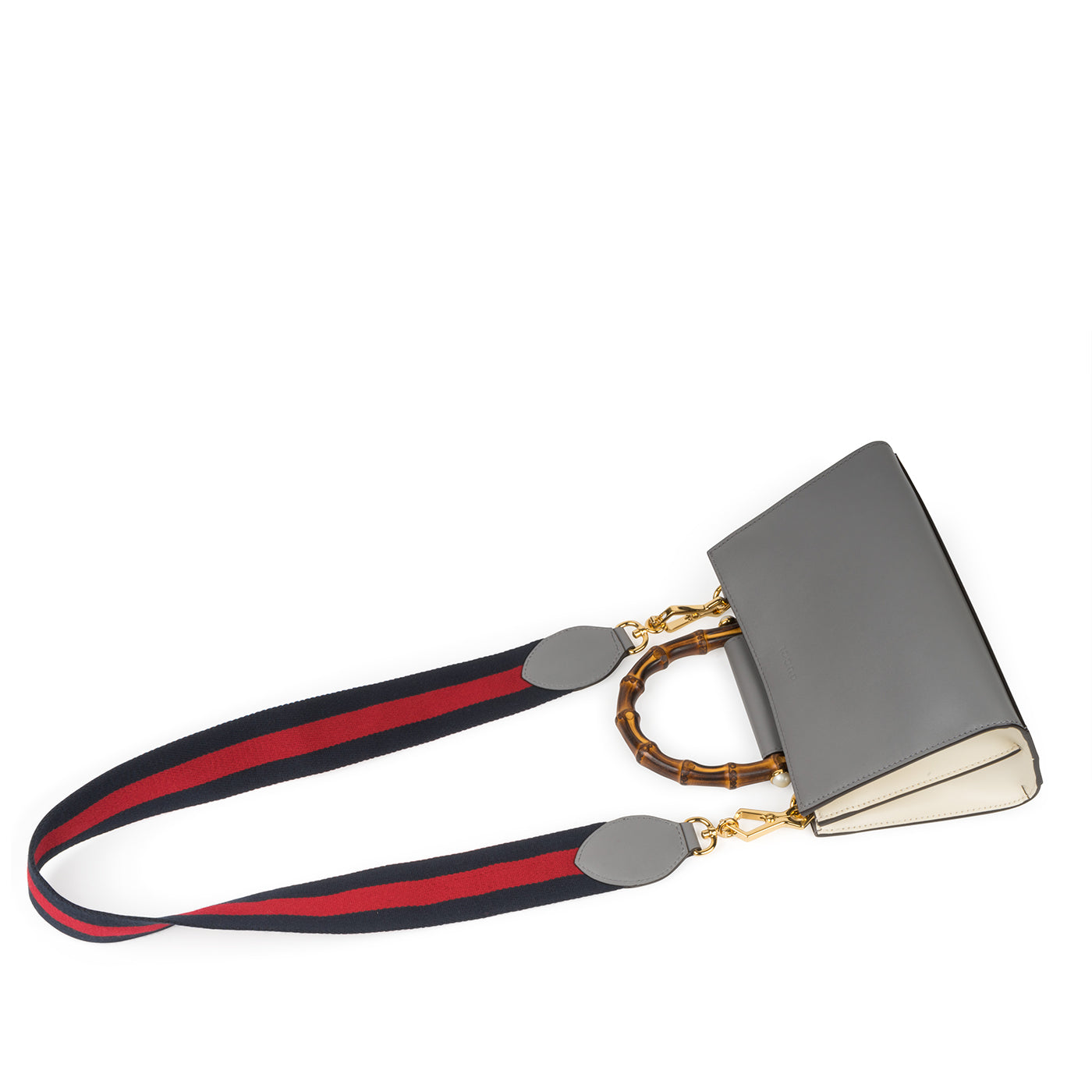 Carefully crafted from smooth grey leather, the mini Gucci Nymphaea is the perfect balance between youthful and sophisticated. With white leather sides, a bamboo top handle and a removable blue and red striped shoulder strap, this understated gem is an absolute must-have for any Gucci lover. Suitable for day and evening usage, the mini Nymphaea is the perfect compliment to anything you my have in your wardrobe due to its neutral hue. Modern and contemporary but also a brand classic, this stunning piece is one you'll have forever.?ÿ