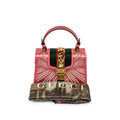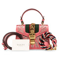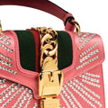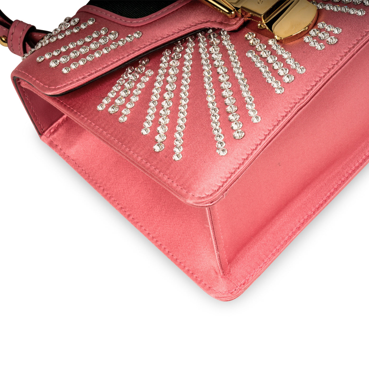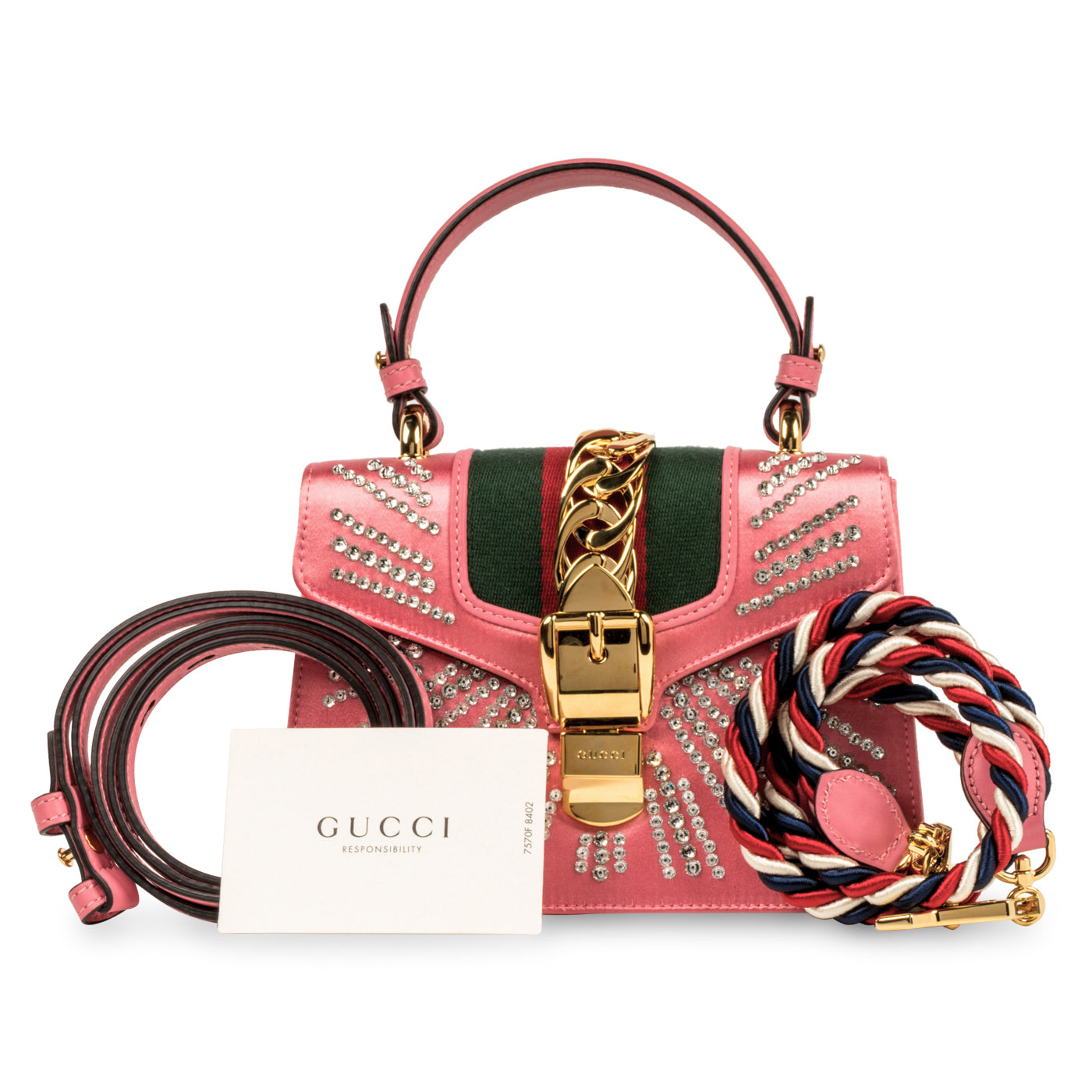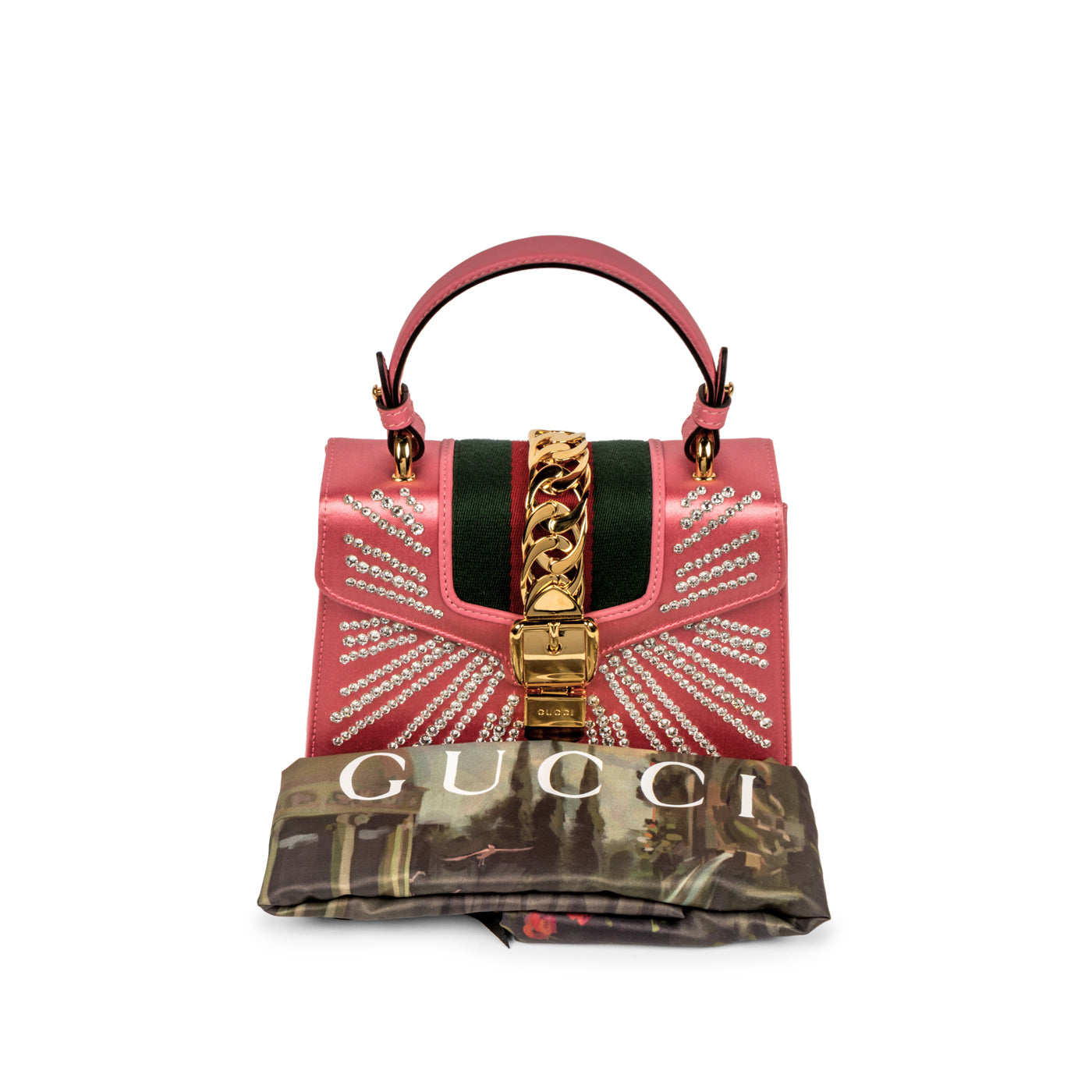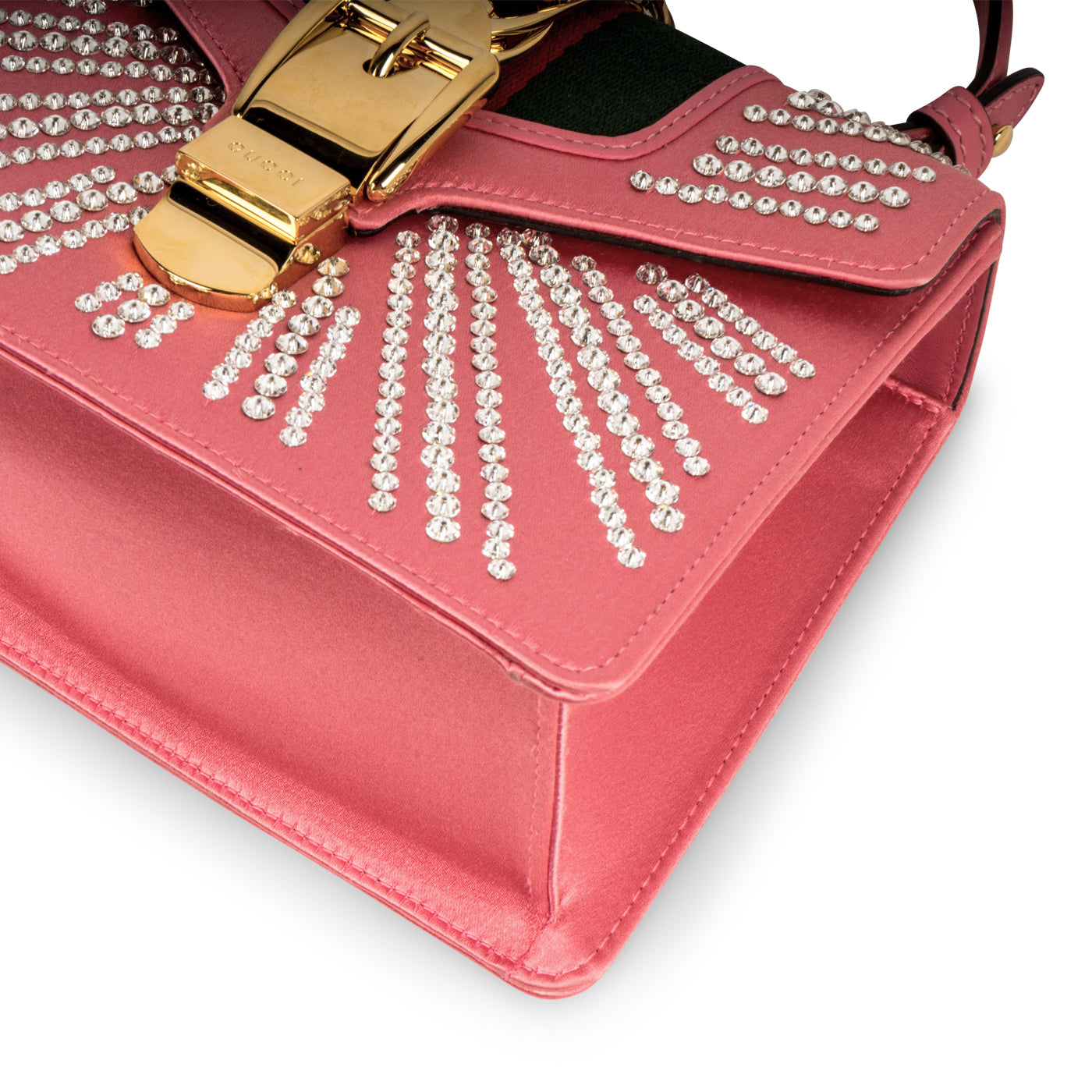 The Gucci Sylvie is one of those bags that became a classic the moment it landed in stores ƒ?? and though we love a traditional classic here at Bagistry Closet, we love a classic with a modern twist even more. Crafted from pink satin, featuring the brandƒ??s signature green and red fabric strip, prominent gold-tone buckle detail and embellished with crystals throughout, itƒ??s safe to say that this bag is basically the greatest thing youƒ??ve ever seen. This Sylvie is luxurious, glamorous, completely OTT and the perfect accessory to compliment to any neutral-toned or monochromatic outfit. Whether you dress the Sylvie up or down, you can be sure this bright, bold piece is the ideal accessory for any occasion. Joyous, youthful and effortlessly elegant at the same time, the Sylvie is a well-worthy addition to any luxury handbag collection.?ÿ