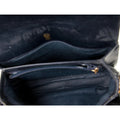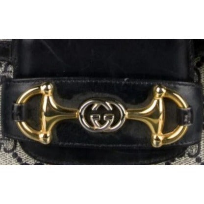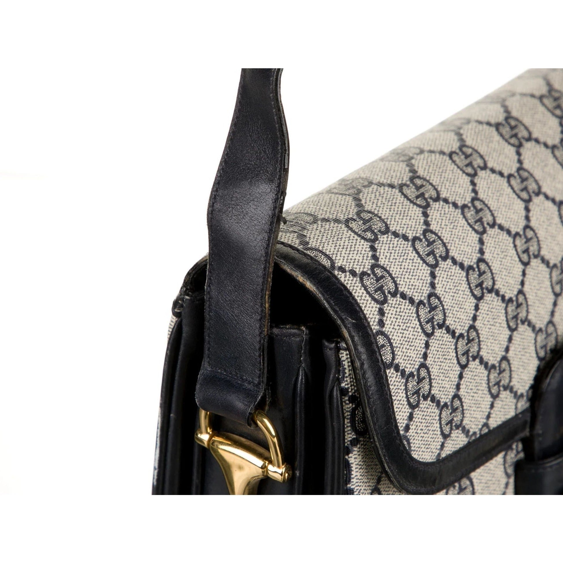 This style was re-released by Gucci and the vintage version is almost identical to the 21st century style! The bag is a large, envelope top, shoulder purse. The body is made of rich navy leather and blue Guccissima print coated canvas. It is a rectangular shape and has bold gold hardware, including a great horse bit accent at the center where it closes and equestrian ones at the sides where the strap is attached! The purse has an expandable, accordion style bottom, so it can hold a lot more than you might think!