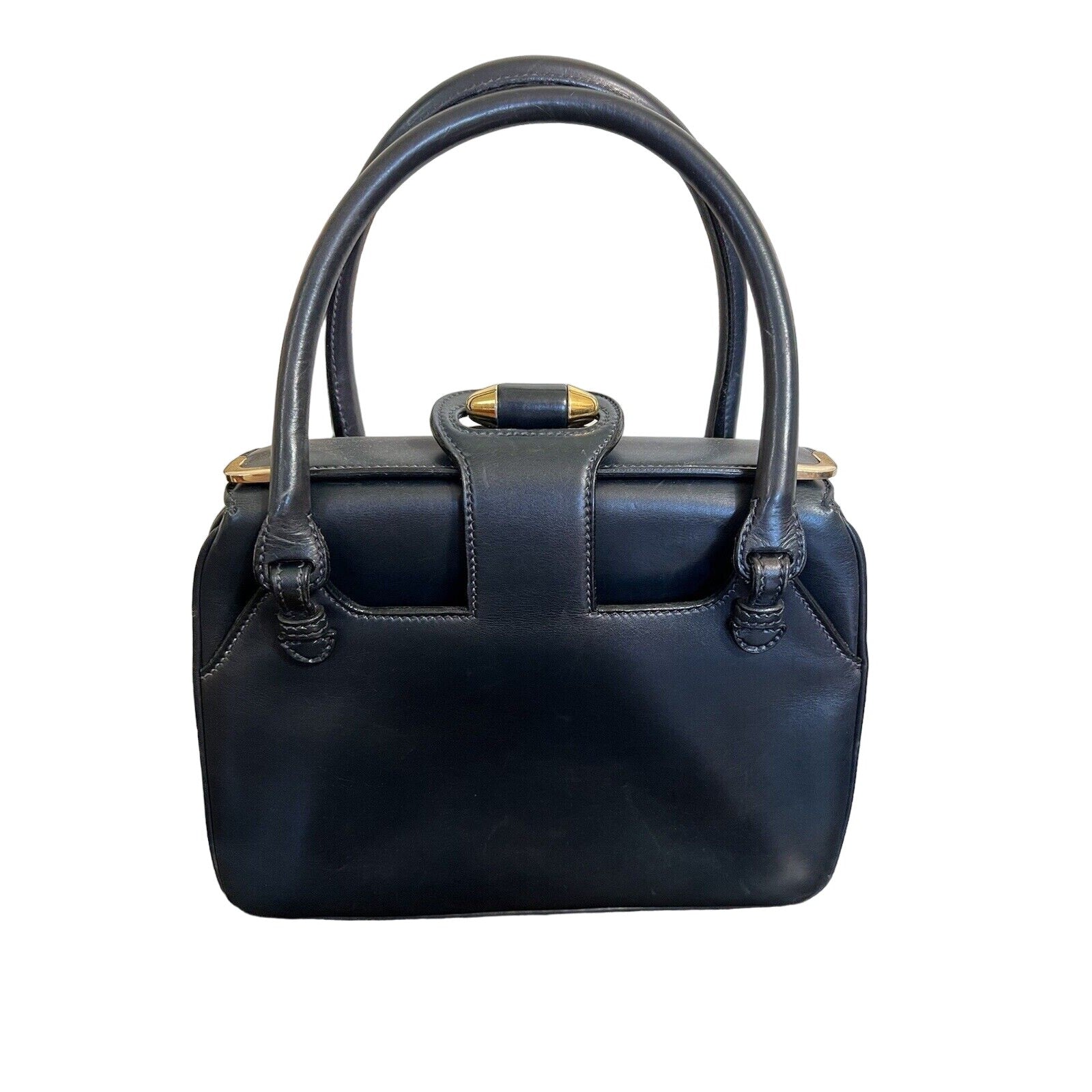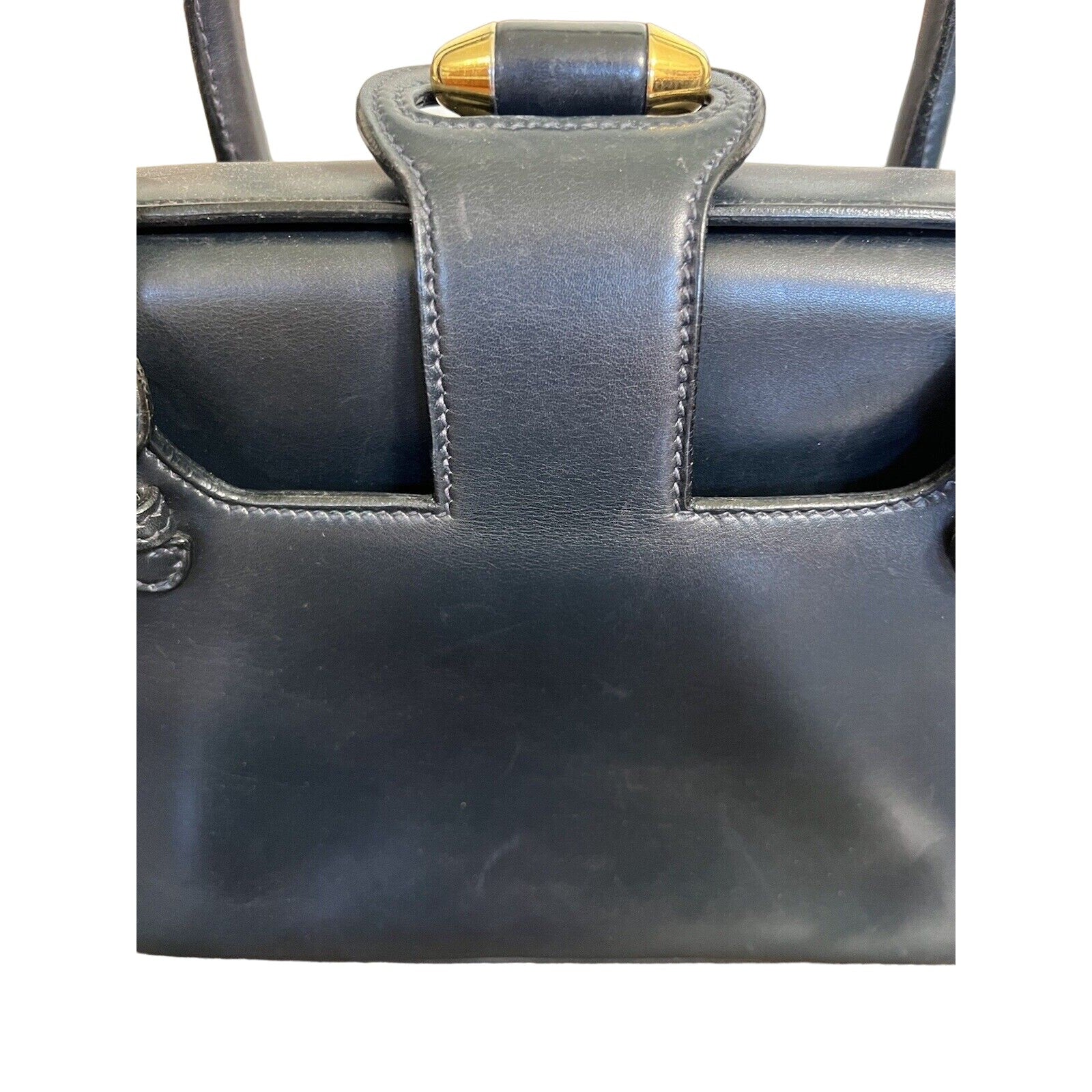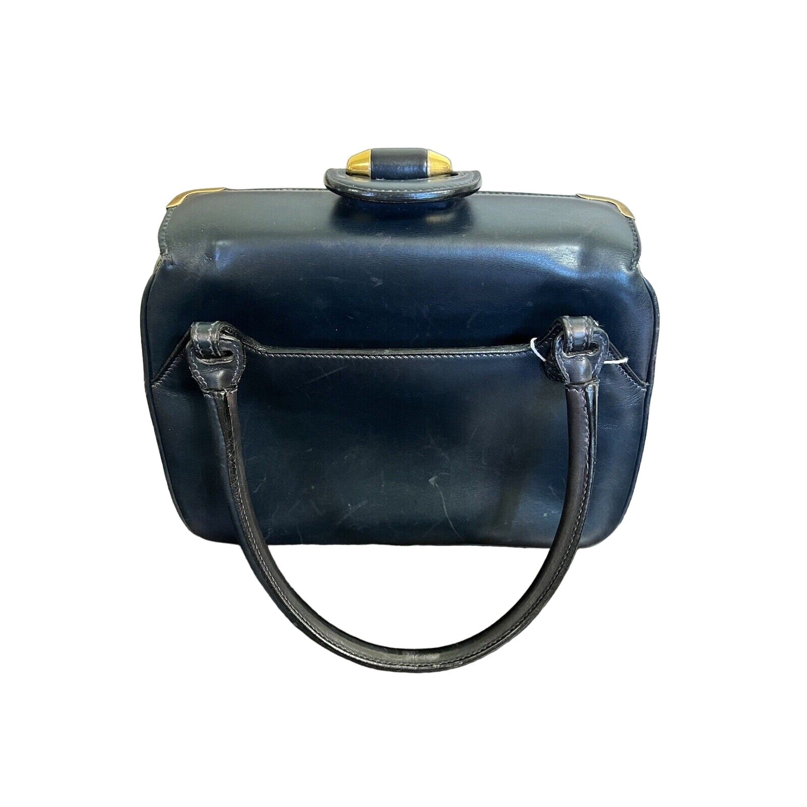 This is a fabulous, GUCCI, top handle, shoulder bag made from supple navy leather! It is a shoulder bag style with two, exterior pockets and two, longer, leather shoulder straps! The purse has a hard, structured frame and square shape. The purse has a hinged opening with a unique gold & leather accent at the clasp and with gold GG logo engraved hardware throughout.