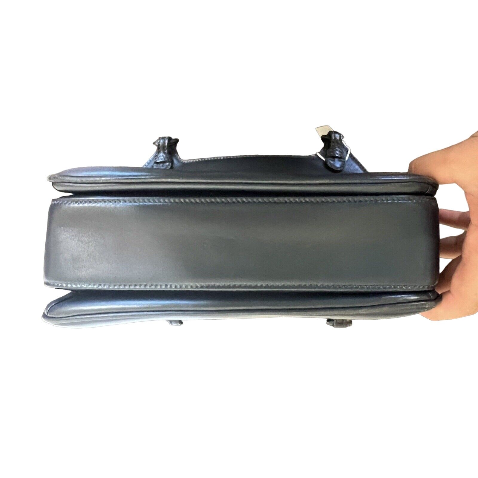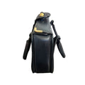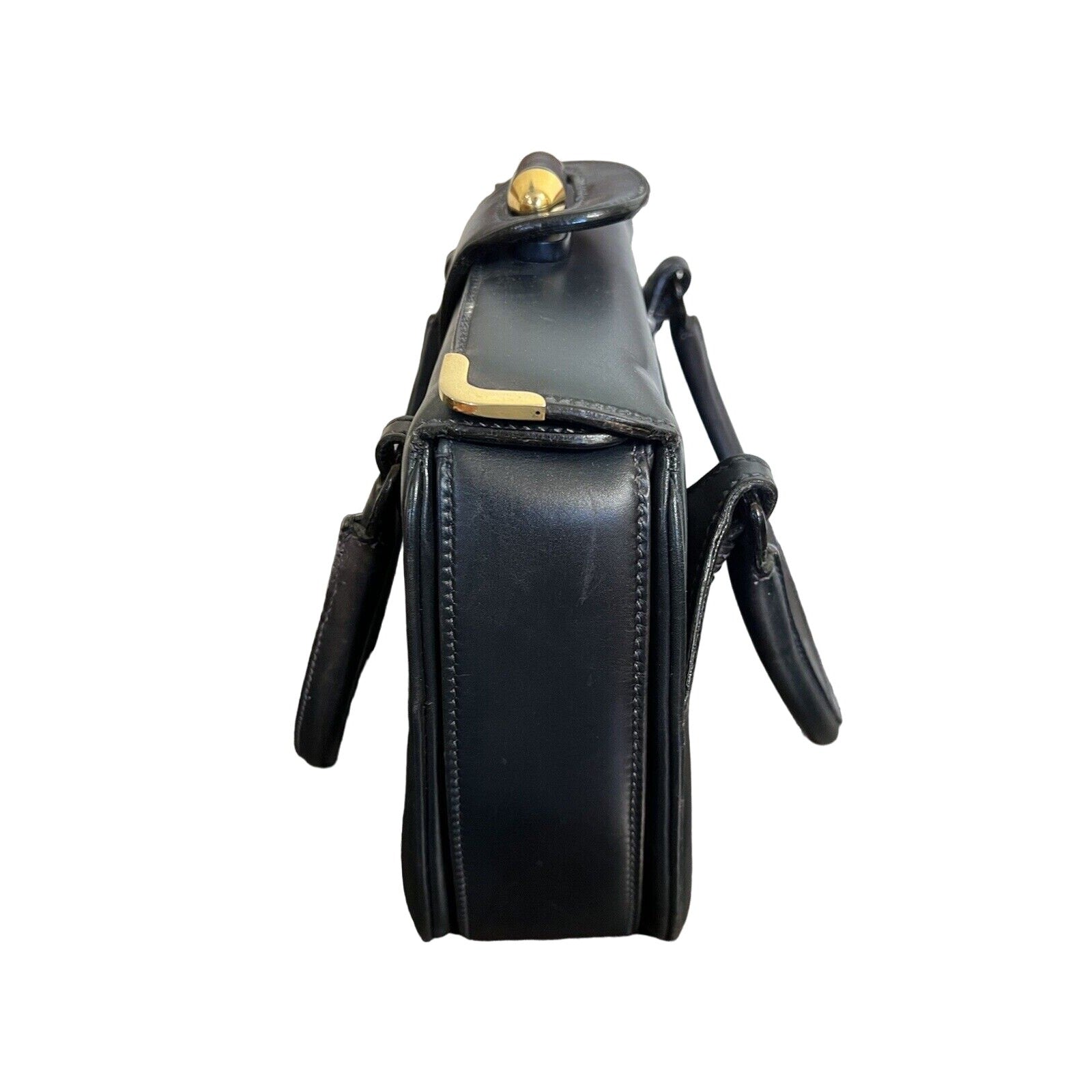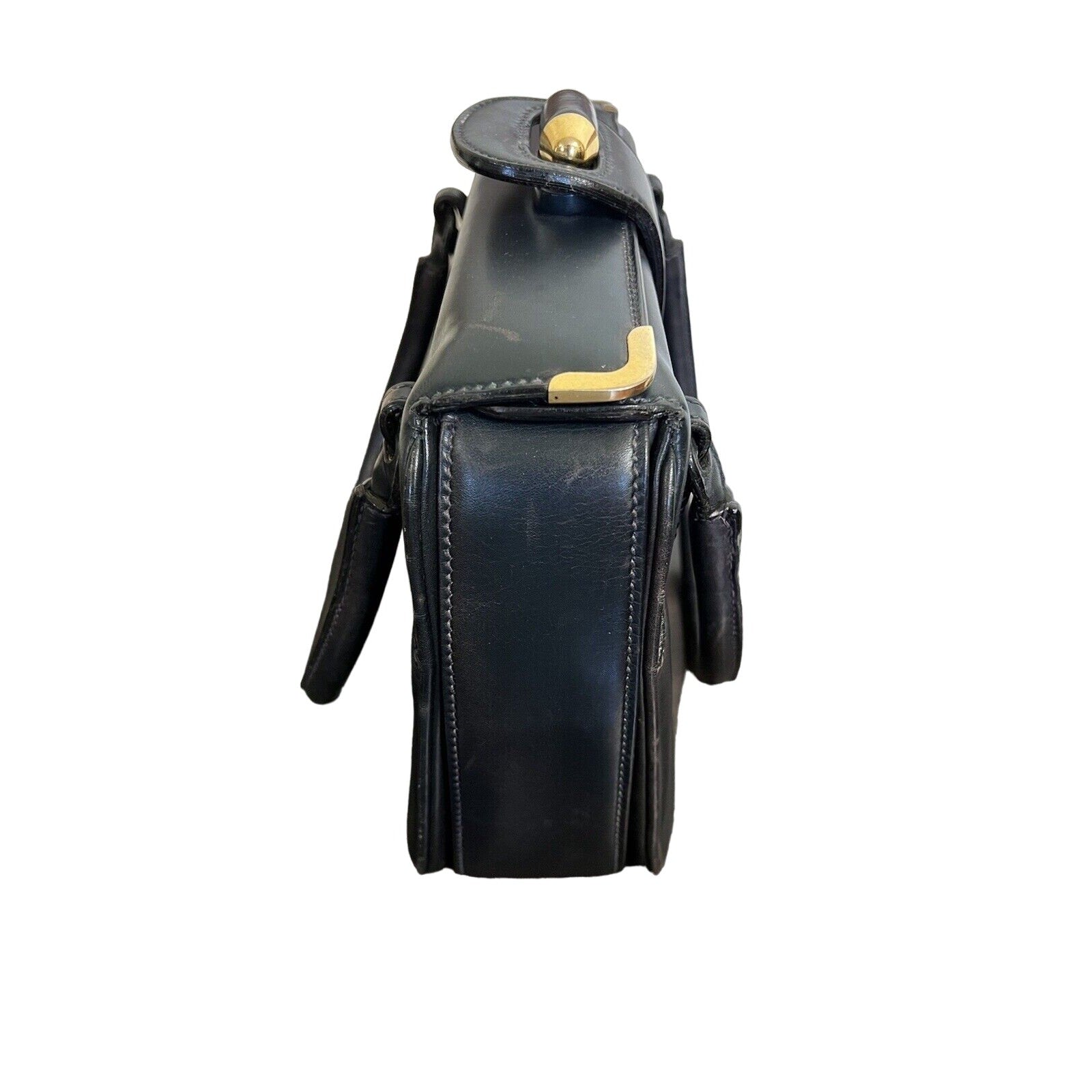 This is a fabulous, GUCCI, top handle, shoulder bag made from supple navy leather! It is a shoulder bag style with two, exterior pockets and two, longer, leather shoulder straps! The purse has a hard, structured frame and square shape. The purse has a hinged opening with a unique gold & leather accent at the clasp and with gold GG logo engraved hardware throughout.