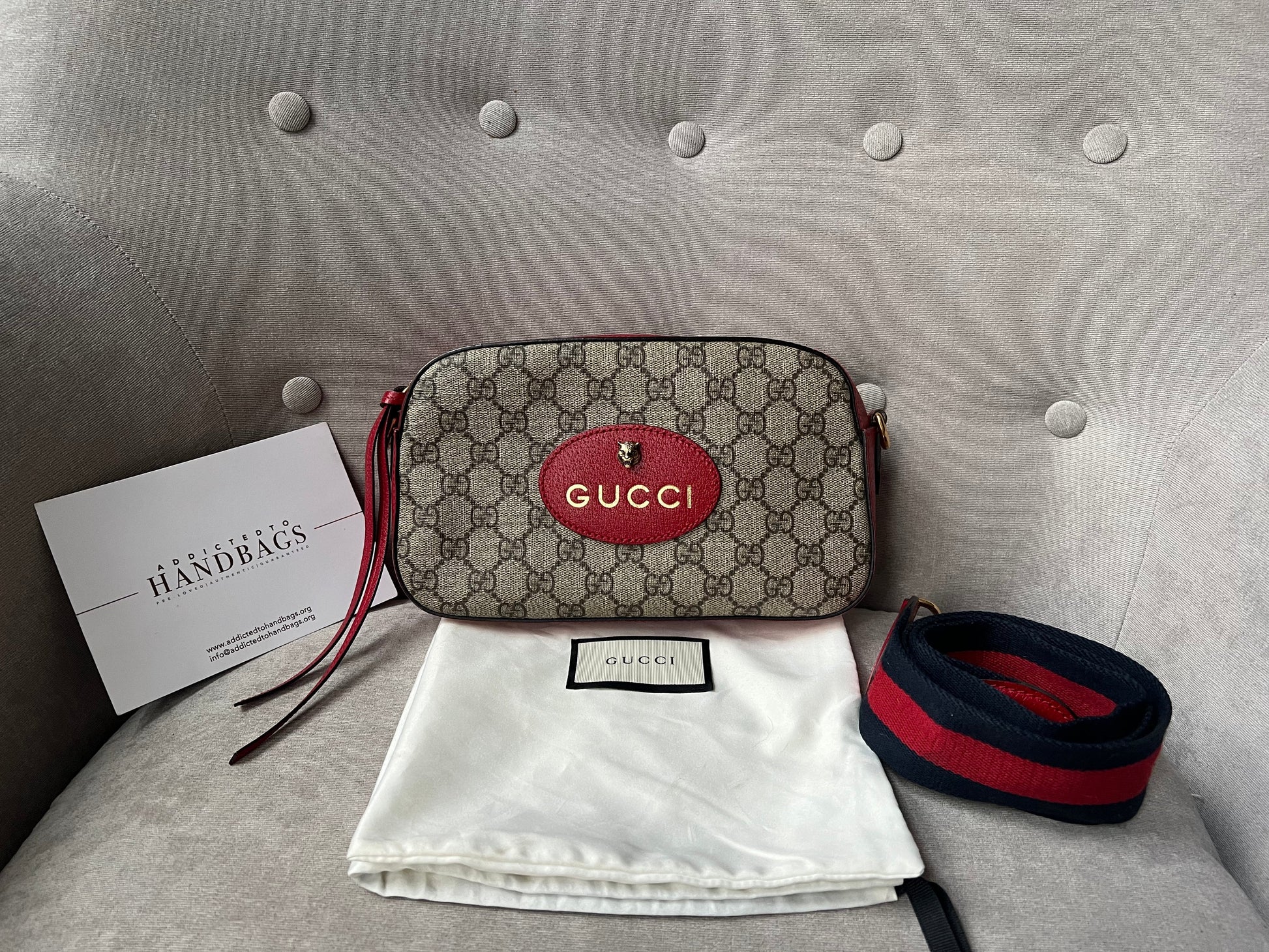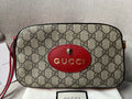 Gucci Neo Vintage GG Supreme Messenger Bag. Crafted in GG supreme canvas, this camera bag style has red leather details. With its zipper closure, this secure and compact style is ideal for day to night use. Can be carried over shoulder and potentially cross body subject to size and height.