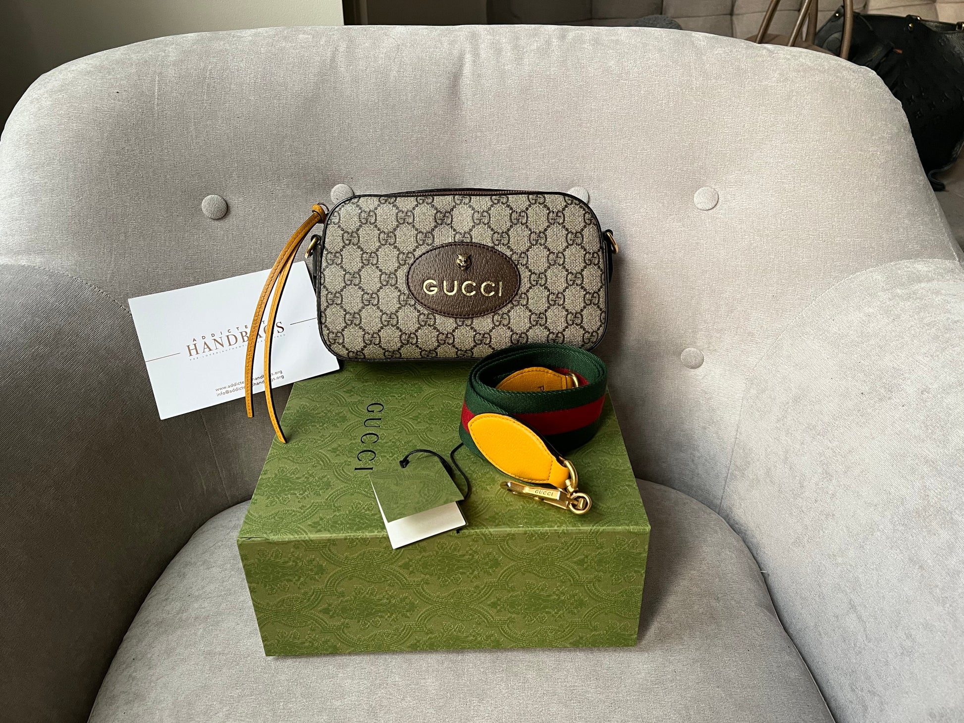 Gucci Neo Vintage GG Supreme Messenger Bag. Crafted in GG supreme canvas, this camera bag style has yellow leather details. With its zipper closure, this secure and compact style is ideal for day to night use. Can be carried over shoulder and potentially cross body subject to size and height.