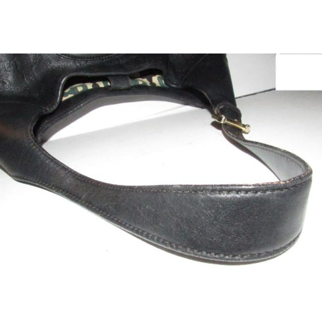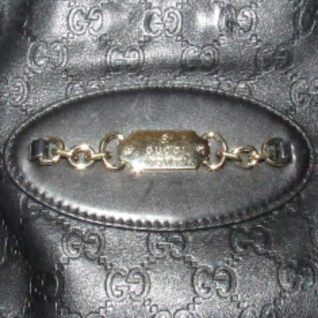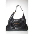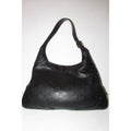 Gucci has recently re-released their 1961 Jackie style hobo and this style is very similar to it! It is made of a classic, supple black leather that is embossed with the Guccissima print. The purse is the largest of the sizes in which this style was offered. At the center, it has an engraved gold equestrian style accent that consists of a rectangular tag that reads, 'Gucci, Made in Italy' which is attached to the purse on both sides by a chunky gold chain. It has a unique, hidden, leather tab style closure on the interior.