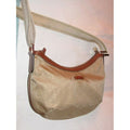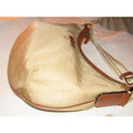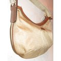 The bag is the perfect neutral light tan colored, embossed large G logo print nylon (?), chestnut brown leather with a wide ivory and metallic striped canvas strap purse by Gucci that no one else will have! The purse is a unique take on the extremely pricey, embossed leather purses Gucci makes! It has a strap that is extra wide with an ivory and metallic gold striped design and can be doubled or worn as an extra long strap! The hardware and accents are gold tone. It has the true 1960's Gucci high-end bohemian look! This could be great any time of year as your everyday neutral brown bag!