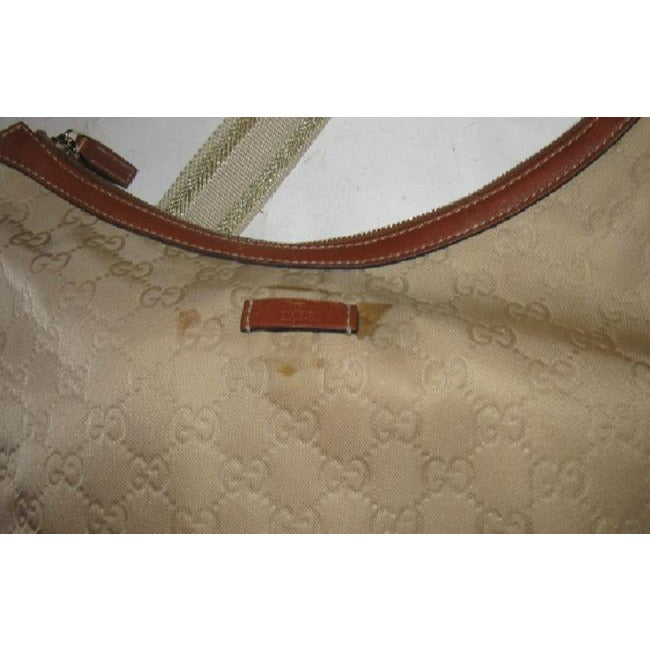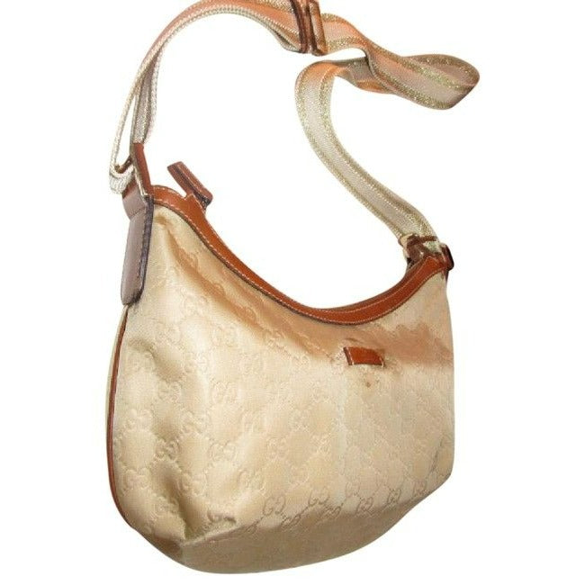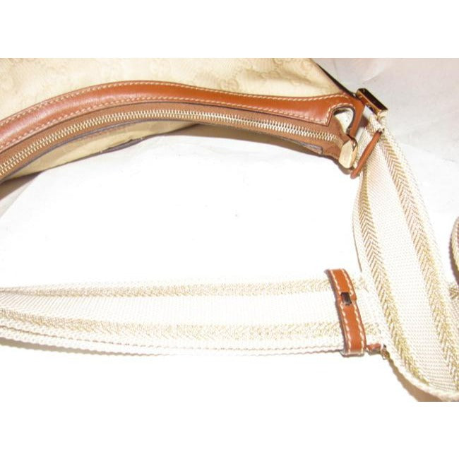 * For sale is a Gucci, light tan embossed large G logo print nylon (?), chestnut brown leather, and wide ivory and metallic striped canvas strap, top zip, hobo style, large, cross body or shoulder bag with an adjustable strap, darts at the bottom corners so it can expand, and bold gold tone accents! It is a modern take on the original 1960's classic bohemian style from Gucci that would be great used as your signature purse!