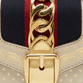 All the creations from Gucci like this Sylvie bag reflect a sense of innovation and tradition. Crafted from star printed leather it is admired for its timeless elegance and structured silhouette. The striking chain design on the Web stripe detailing elevates the appeal of the bag and it can be carried around with a shoulder link along with a top handle. Lined with Alcantara the interior is secured by a branded buckle closure.