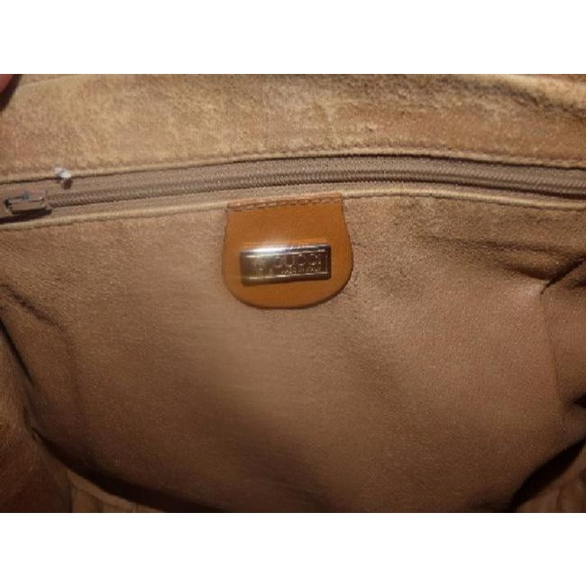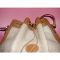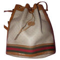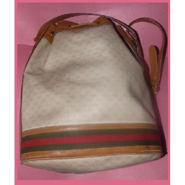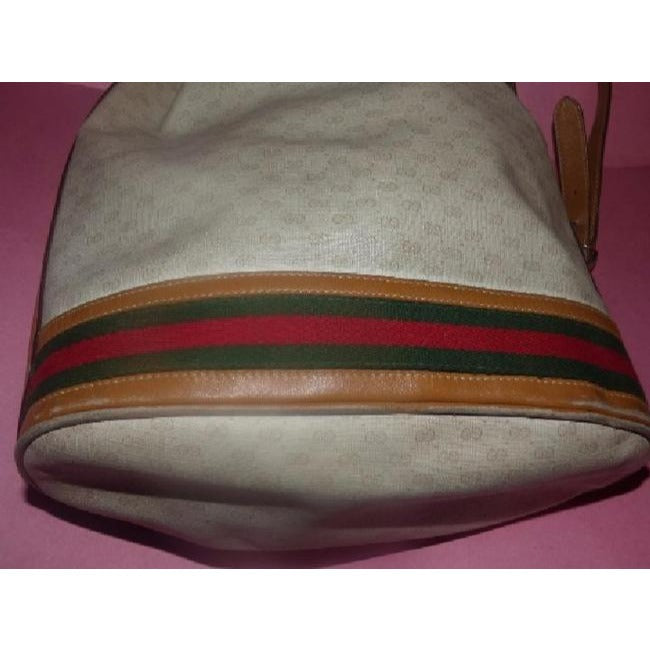 The bag is a cream, coated canvas and camel leather Gucci bucket purse that is probably from the 1980's/90's. It is a drawstring bucket / shoulder style with lots of room. It has the small G logo design in camel colored brown against the cream body and camel leather accents at the top, strap and piping. Around the bottom, there is a stripe in red and green! There is a zip pocket on the inside. This is a perfect signature purse.