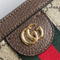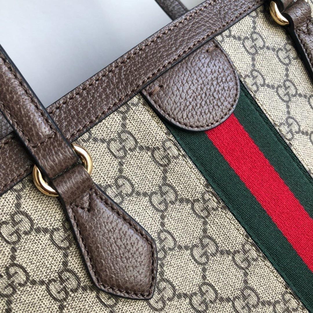 classic combination of the House's most defining codes??the GG motif and Web stripe??the world of Ophidia continues to evolve, incorporating new shapes and silhouettes each season. With recognizable design elements in a practical new shape, this new medium sized tote is trimmed with textured leather and topped with Double G hardware. Thanks to its long leather handles, the style can also be carried as a shoulder bag.