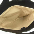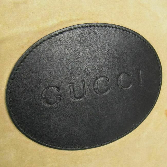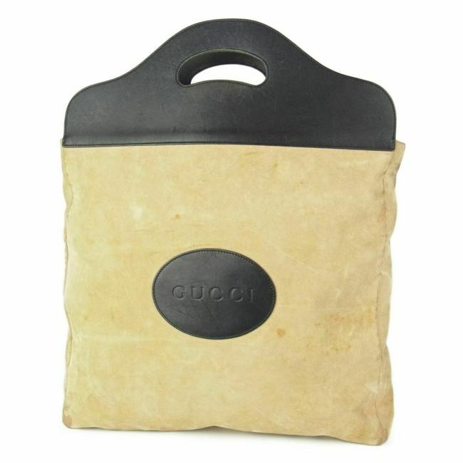 The bag is a two handle, tote or satchel style purse by GUCCI. It is made from black leather on top, sides, and handle cutouts, almost like a frame, and ivory suede as the body with an oval leather accent in the center that reads 'Gucci'. It has no top closure. The interior is in excellent overall condition. The bag is in excellent condition, inside and out! It still has a whole life to live with you!