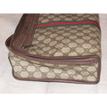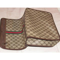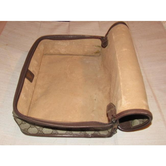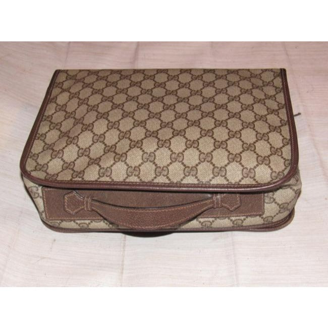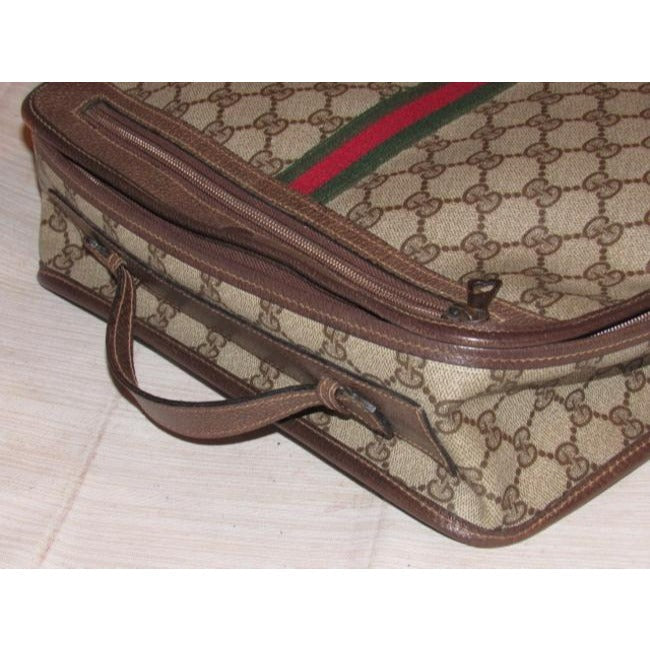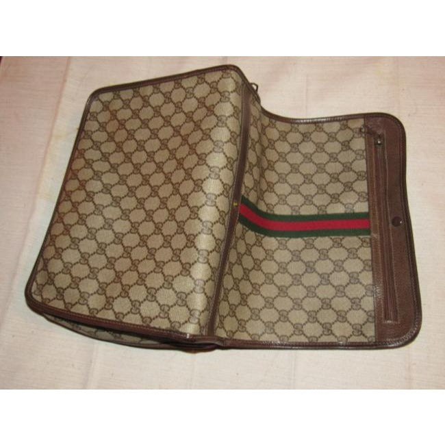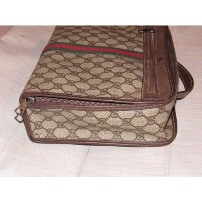 The bag is a large, two-way style- cross body style purse or top handle clutch with a removable strap! The purse has the large, double 'G' logo design in brown coated canvas and leather. The bag has a boxy, structured body with a zip around style top closure. It can be carried by the top handle or removable, adjustable strap. The strap, sides, trim, piping, and other accents are brown leather and in great condition! There is a red & green stripe down the center and the top rolls back and snaps open! It has multiple exterior & interior compartments. This purse is designed in such a smart, organized fashion and is perfect for travel with all of the secure compartments!