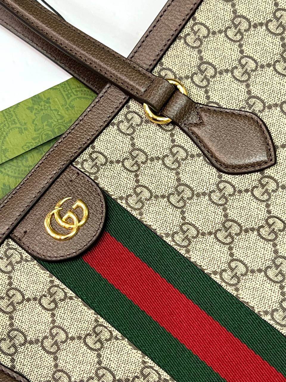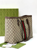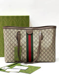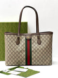 A classic combination of the House's most defining codes�the GG motif and Web stripe�the world of Ophidia continues to evolve, incorporating new shapes and silhouettes each season. With recognizable design elements in a practical new shape, this new medium sized tote is trimmed with textured leather and topped with Double G hardware. Thanks to its long leather handles, the style can also be carried as a shoulder bag.