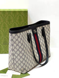 A classic combination of the House's most defining codes�the GG motif and Web stripe�the world of Ophidia continues to evolve, incorporating new shapes and silhouettes each season. With recognizable design elements in a practical new shape, this new medium sized tote is trimmed with textured leather and topped with Double G hardware. Thanks to its long leather handles, the style can also be carried as a shoulder bag.