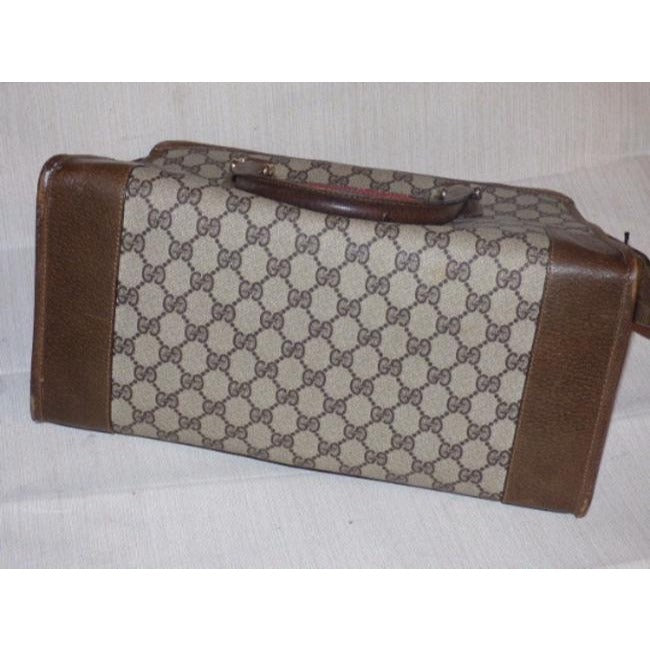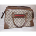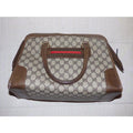 This is a fabulous, extra large size, top zip, 1960's mod, GUCCI, brown large G logo print coated canvas & leather, doctor's satchel or speedy bag style that is so unique! It made of brown large G logo print coated canvas with matching brown leather accents throughout the purse- on the piping, trim, opening around the zip top closure, and two handles. The coolest part of the purse is the way the traditional stripe is incorporated! The red and green stripes are on both sides, horizontally, almost inlaid into the handle attachments!