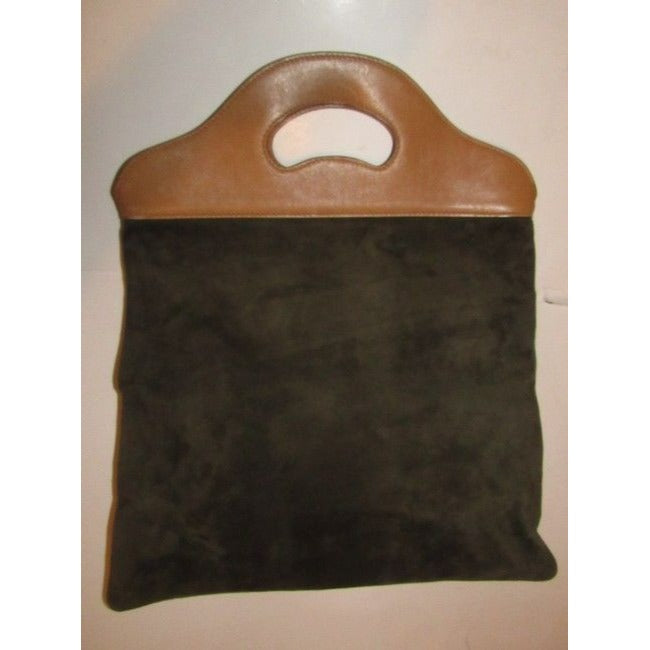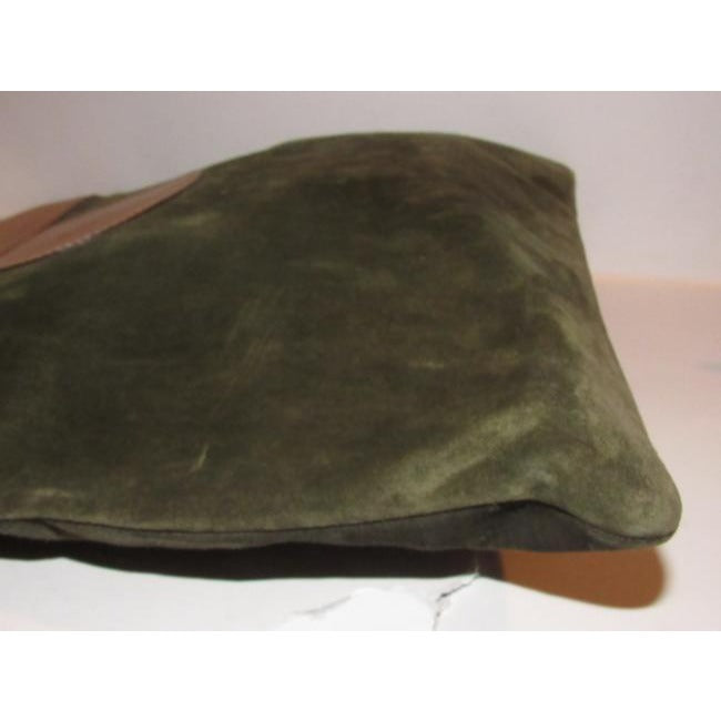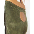 For sale is a vintage, Gucci, olive green suede and camel leather, rare, large tote with a leather oval accent with 'Gucci' embossed at the center and an open top! It is a unique, early bag from Gucci, perfect for any time of year!