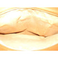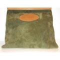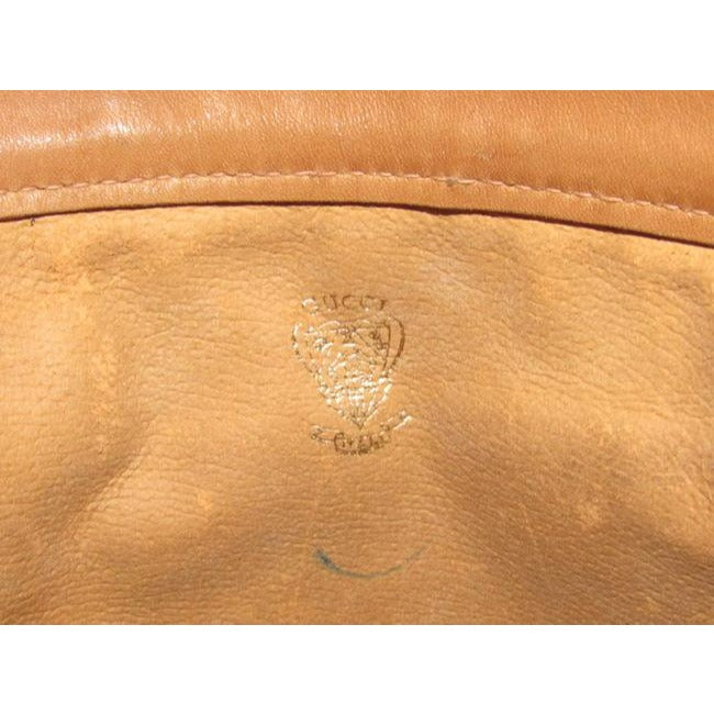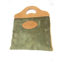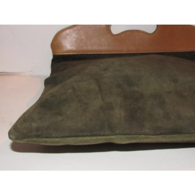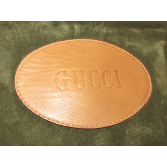 The bag is a two handle, tote or satchel style purse by GUCCI. It is made from camel leather on top, sides, and handle cutouts, almost like a frame, and olive green suede as the body with an oval leather accent in the center that reads 'Gucci'. It has no top closure. The interior is in excellent overall condition. The bag is in excellent condition, inside and out! It still has a whole life to live with you!