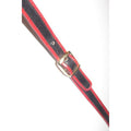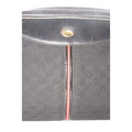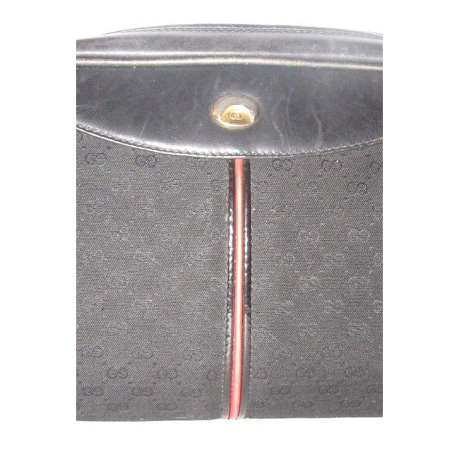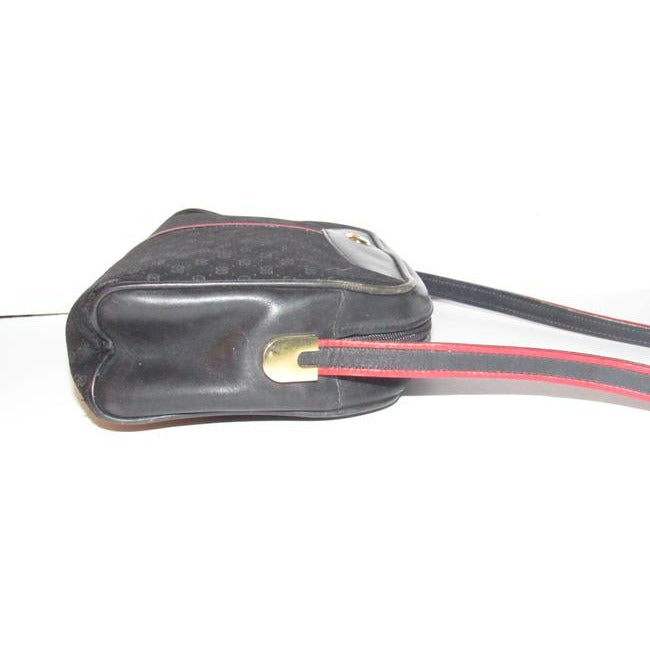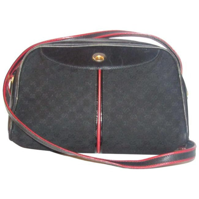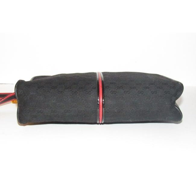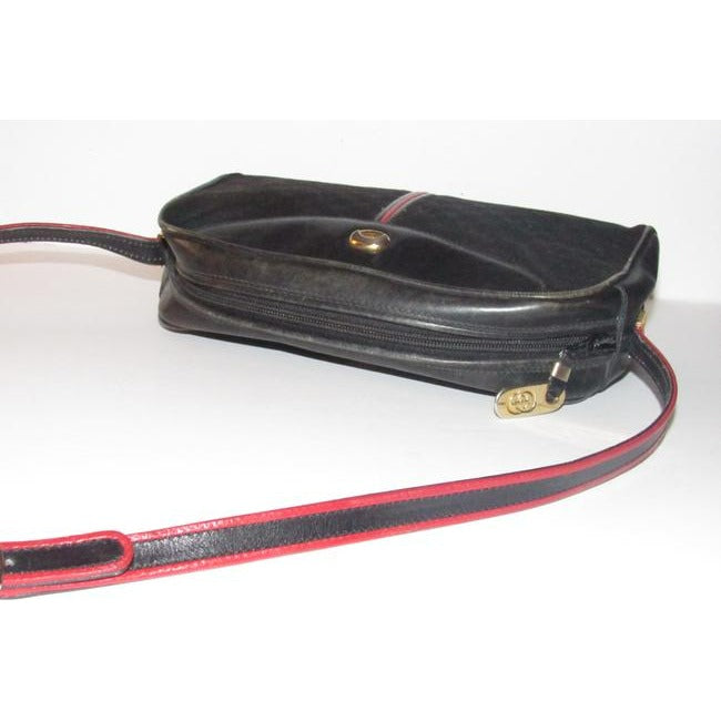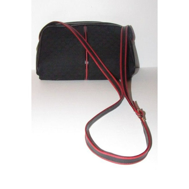 This purse is an unusual version of a shoulder bag or cross body style with amazing attention to detail! The bag is made of black micro Guccissima print canvas and black leather with a long, black leather shoulder strap with red leather framing it! There are other areas with the red and black trim accents. It is a classic, rectangular shape with a zip close top and gold, engraved Gucci hardware and fobs.
