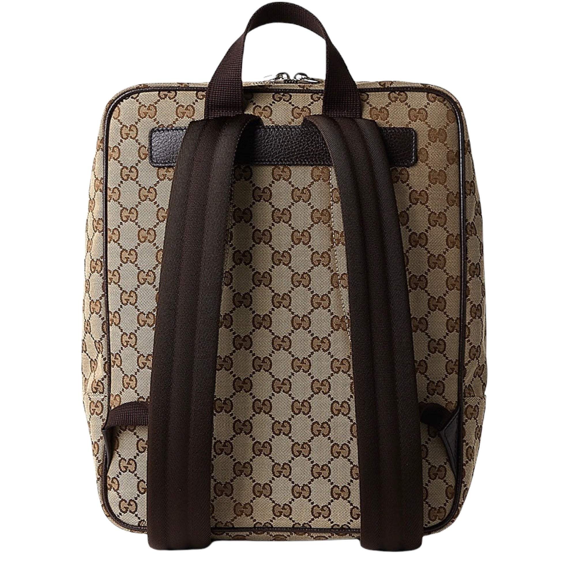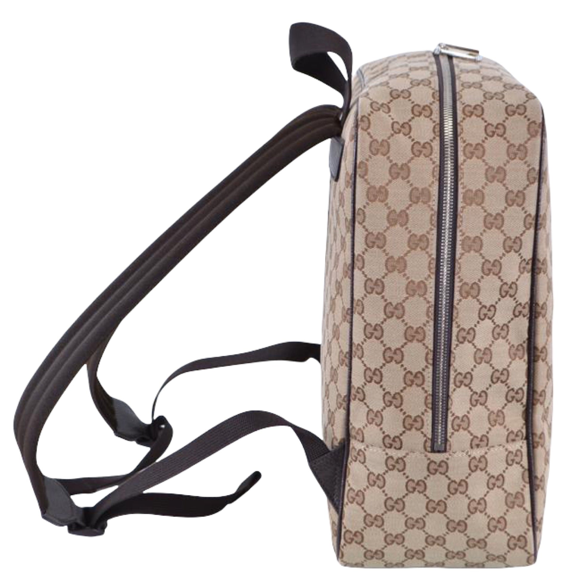 Thisbrown and beige Orginal GG Canvas backpack from Gucci is made of the iconic interlocking gg logo canvas and leather. The two-way zipper fastening opens to a black nylon-lined interior with a zipper pocket and two slip pockets. The double top handles and adjustable shoulder straps add to the functionality of this bag.
