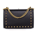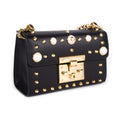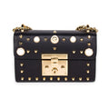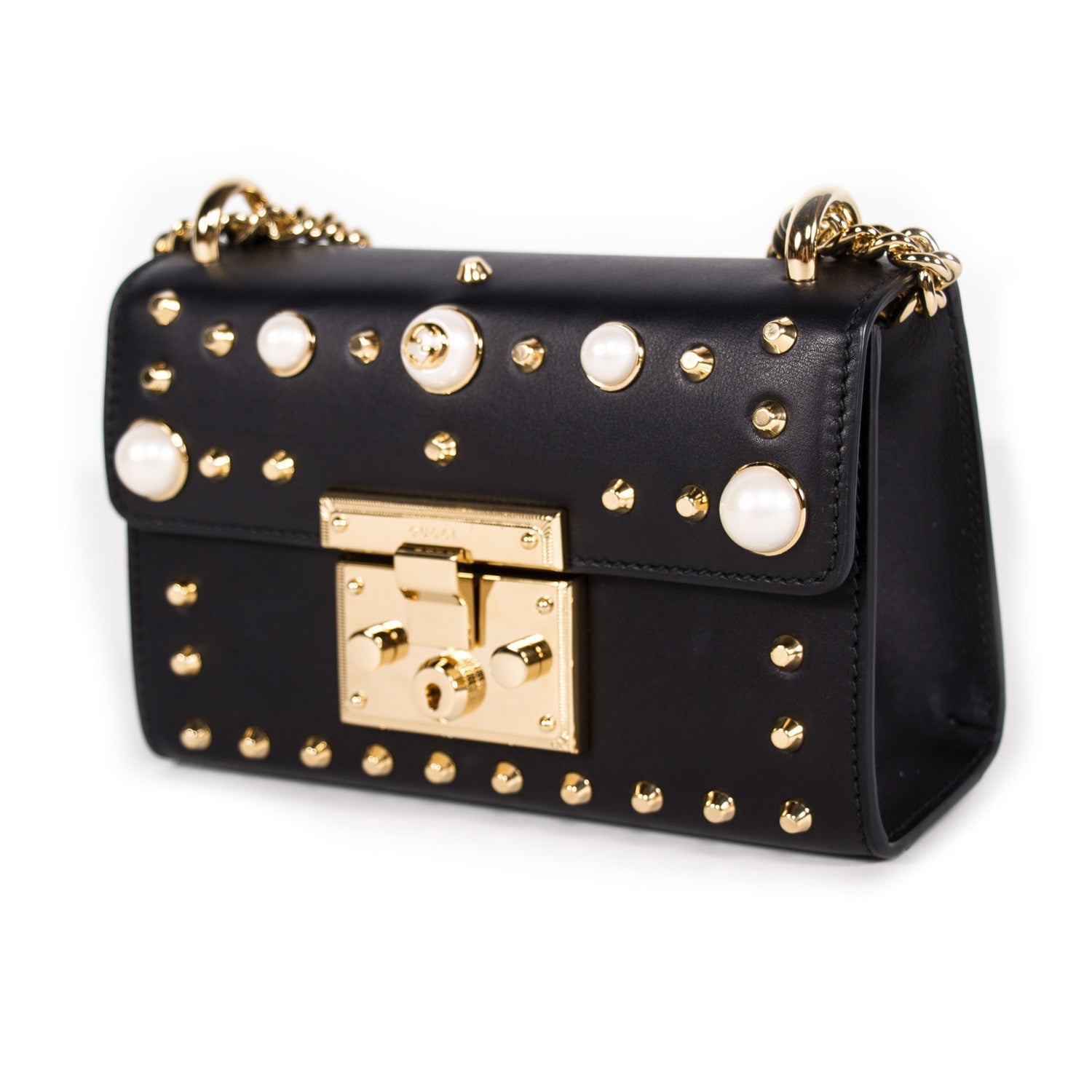 Details: Black Smooth Leather / Gold-Tone Hardware / Chain Shoulder Strap / Gold-Tone Studs and Glass GG Pearl Studs Embellishments at Front and Back /Beige Suede Lining /��Single Compartment and Slit Pocket At Interior / Push-Button Closure at Front Flap