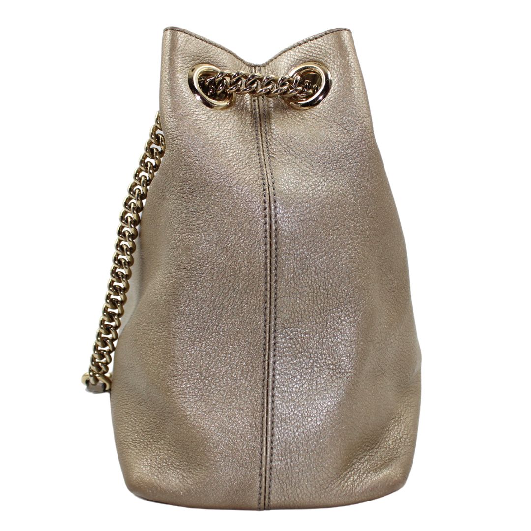 Expertly crafted from luxurious gold metallic pebbled leather, the Gucci Soho Chain Shoulder Bag combines elegance and functionality. Featuring gold hardware and an interlocking GG quilted logo on the front, this bag has a clasp closure and a spacious interior with a zipper pocket. Perfect for adding a touch of glamour to any outfit.