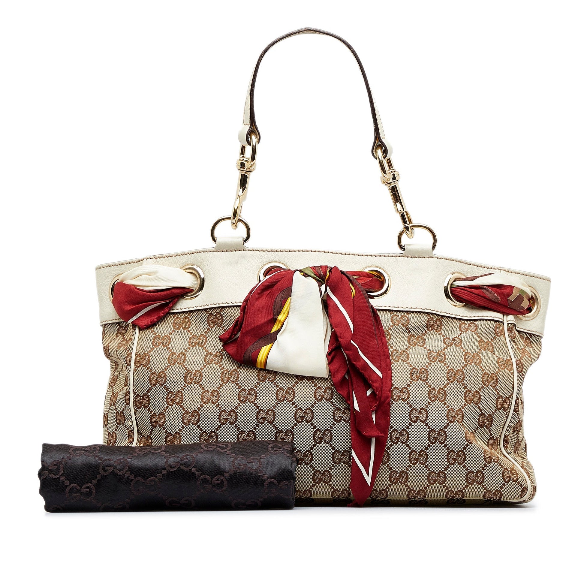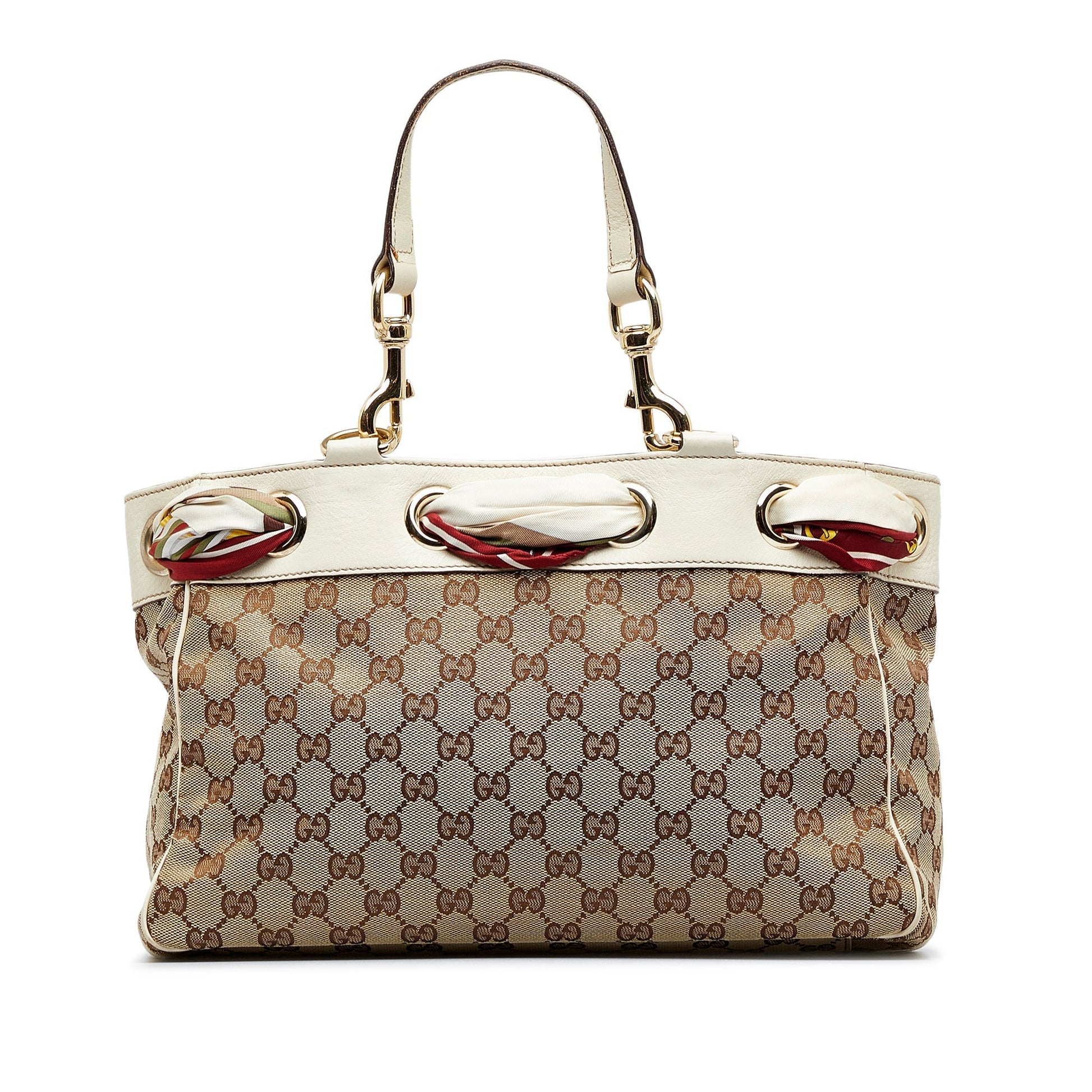 This Gucci Positano Tote Bag is crafted from brown GG canvas and features gold detailing, white leather trim, two flat shoulder straps with chain detailing, and zippered and slip pockets inside. Around the top opening the Bag has a continuous cloth, which Bag closes on the front with a bow. The Bag is near the shoulder or even in the arm or hand.