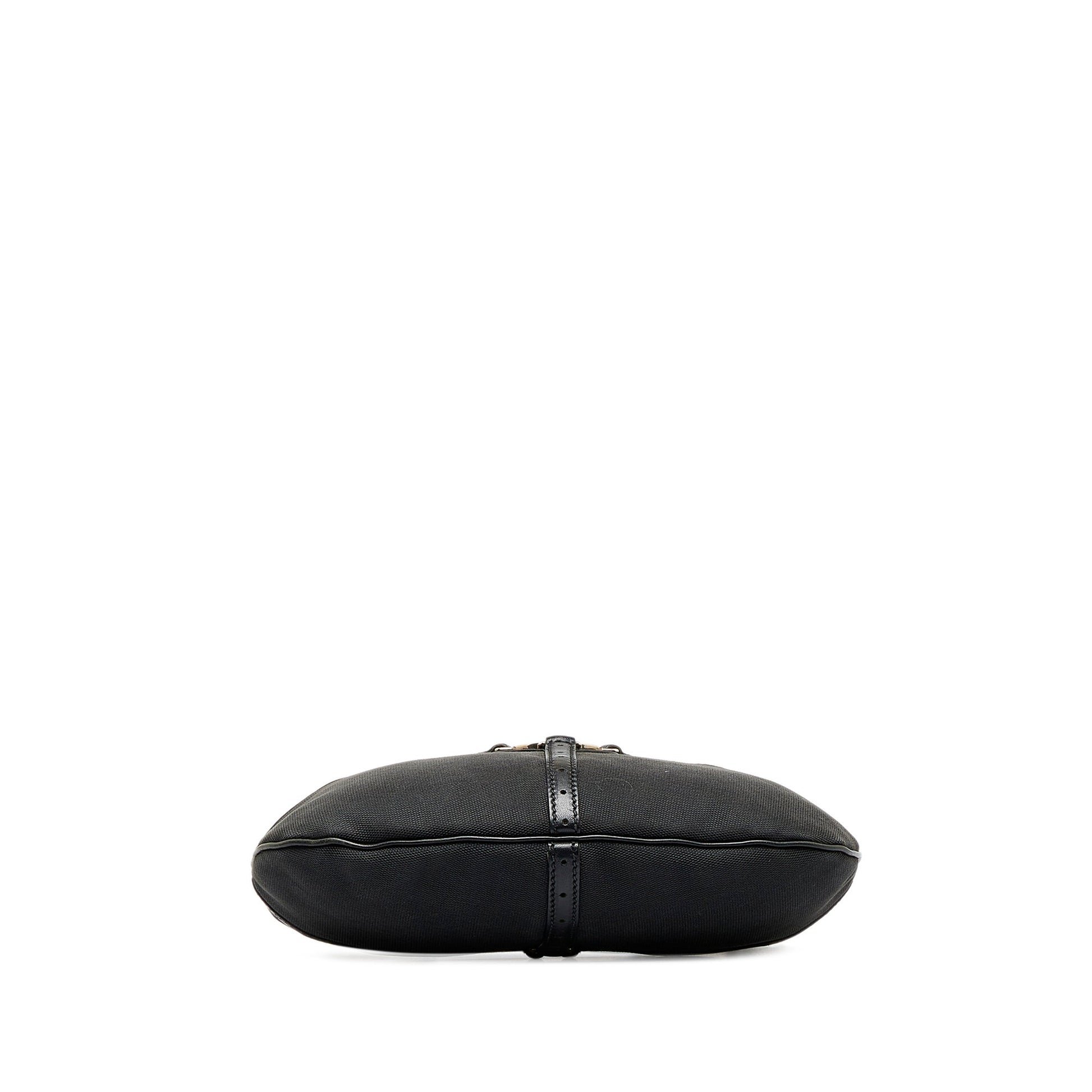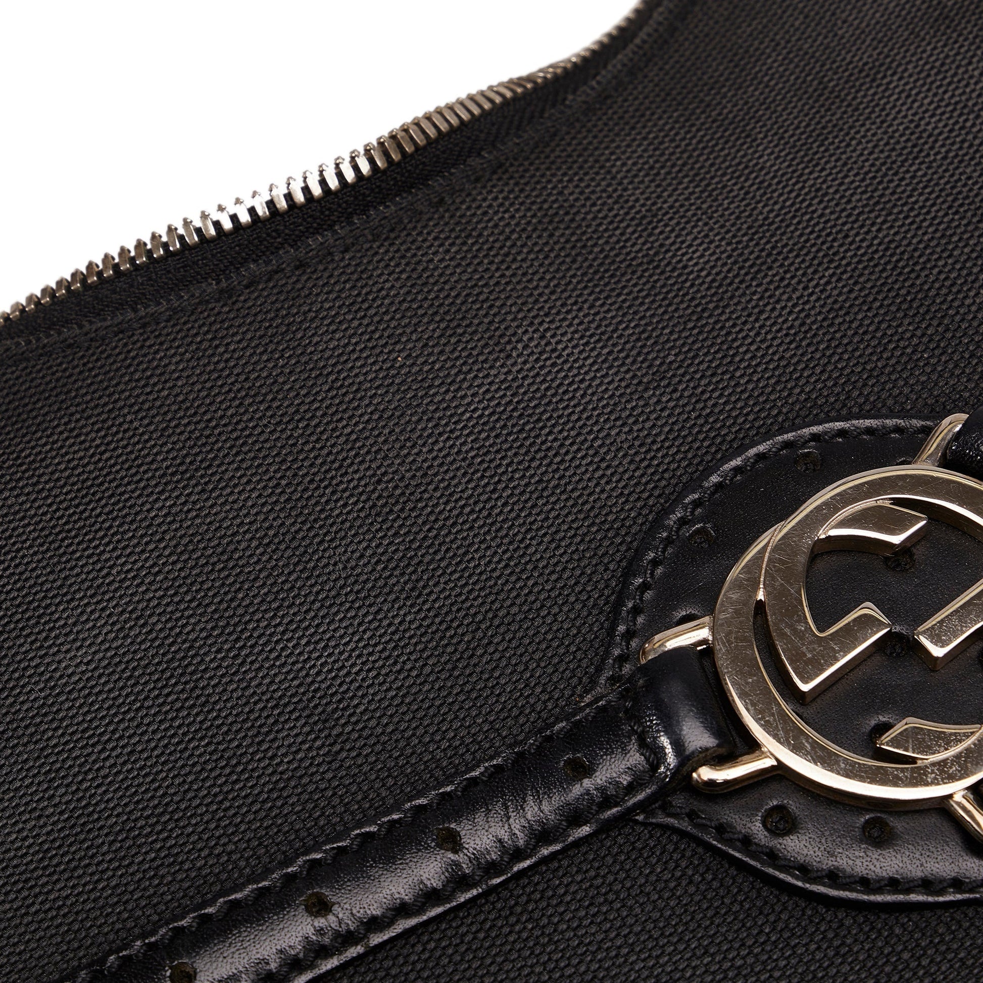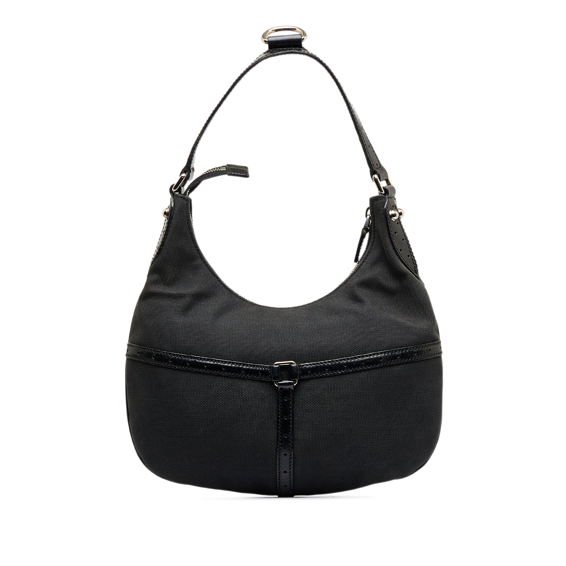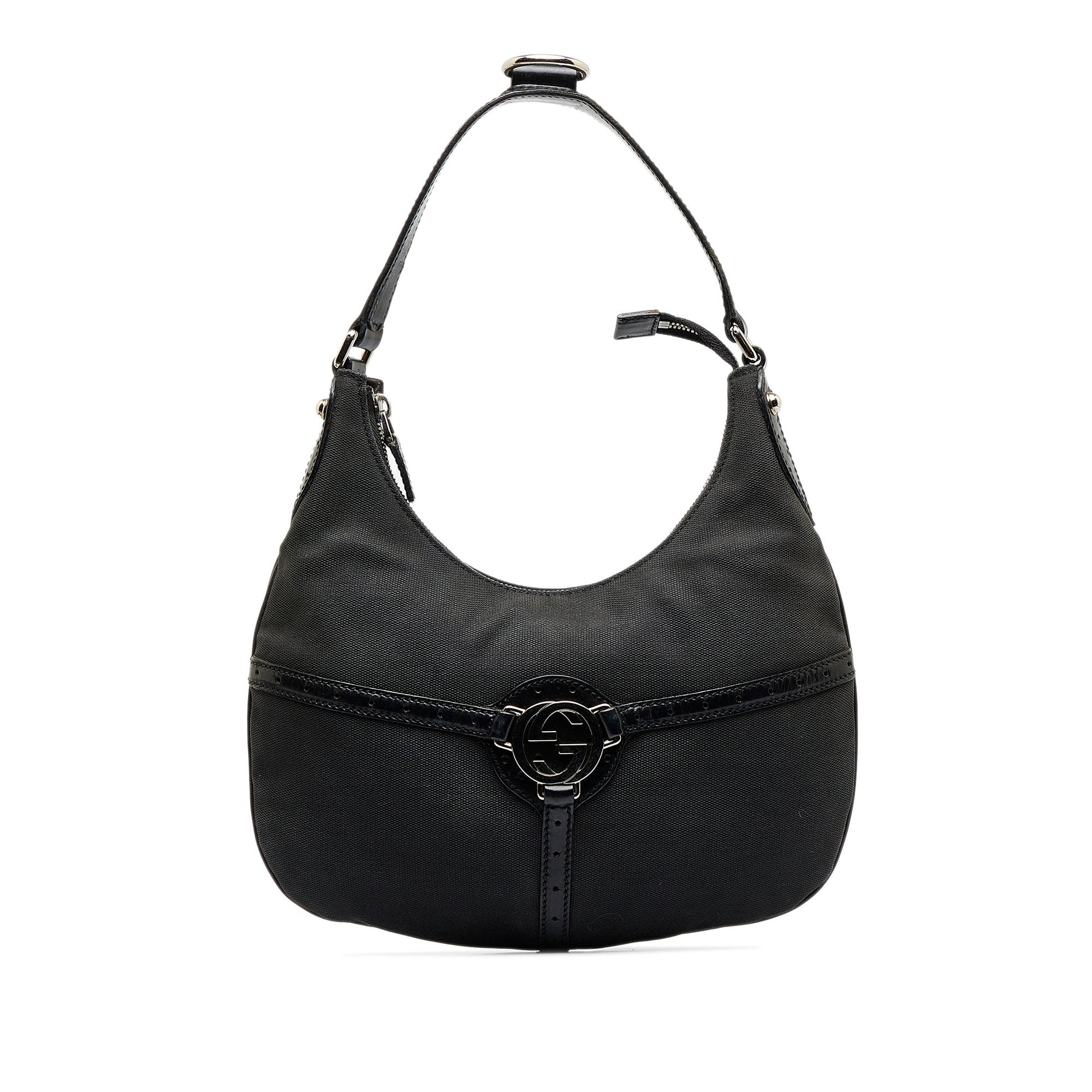 The Reins hobo bag features a canvas body with front leather straps and double G logo, a flat leather strap, a top zip closure, and an interior zip pocket.