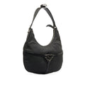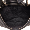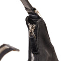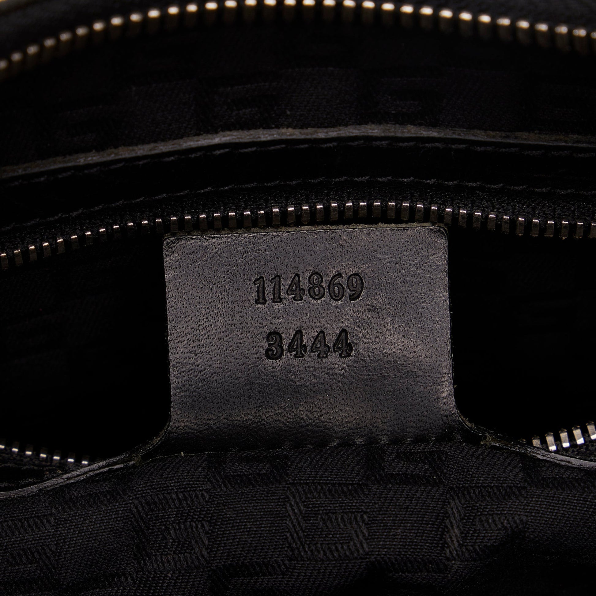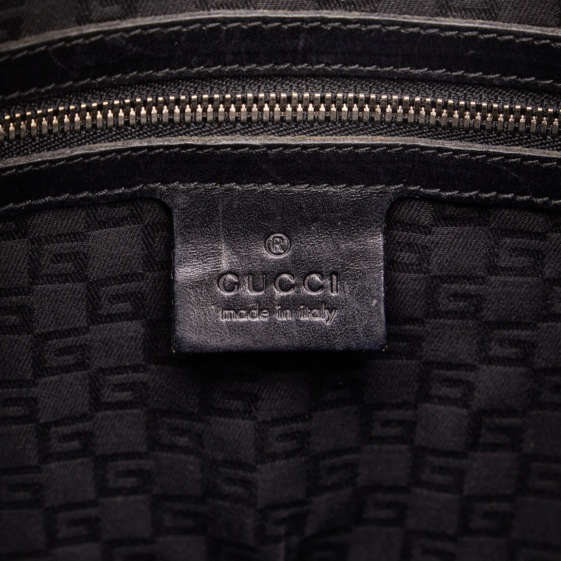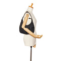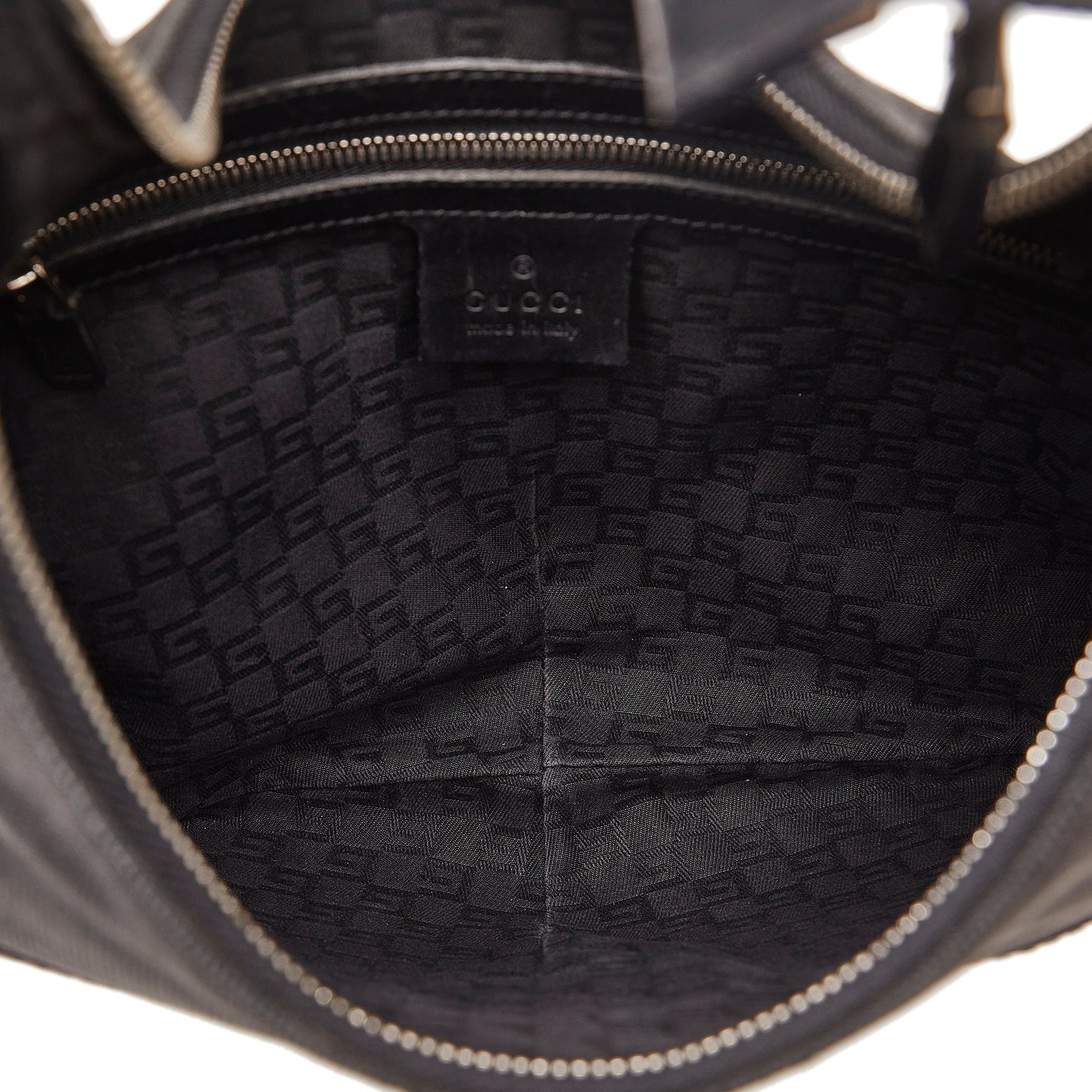 The Reins hobo bag features a canvas body with front leather straps and double G logo, a flat leather strap, a top zip closure, and an interior zip pocket.