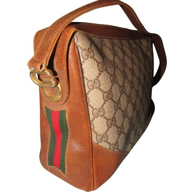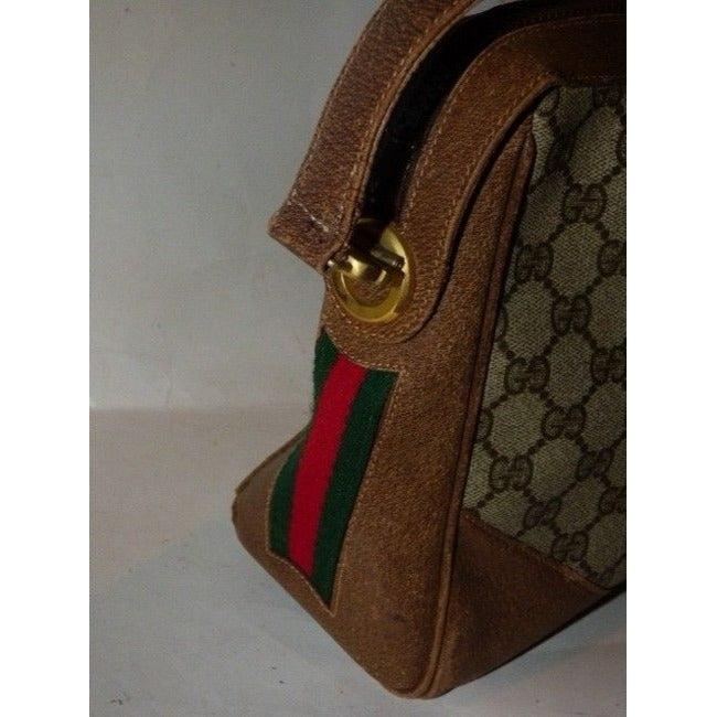 For sale is a vintage, early Gucci, brown, large G logo coated canvas & leather, large, top zip, shoulder purse with inlaid red/green striped accents on the sides and bold gold G logo hardware! The purse is an early design from Gucci that is a perfect year round, signature purse!