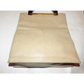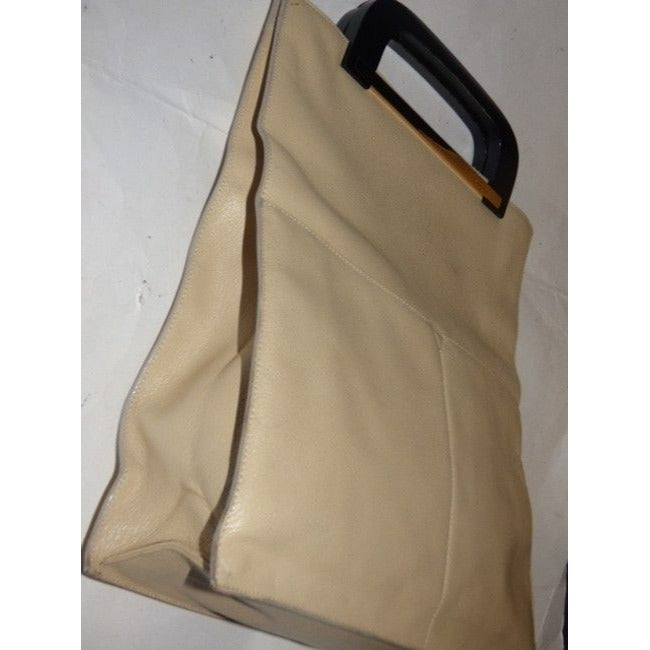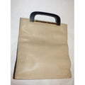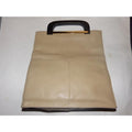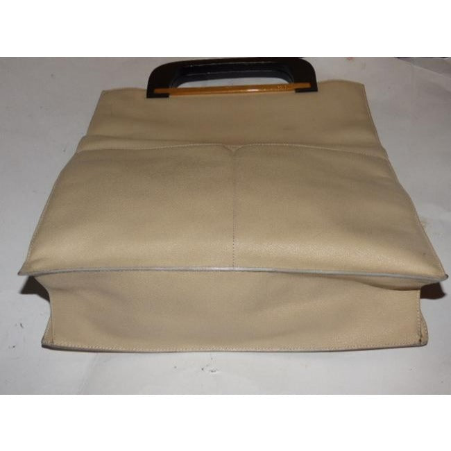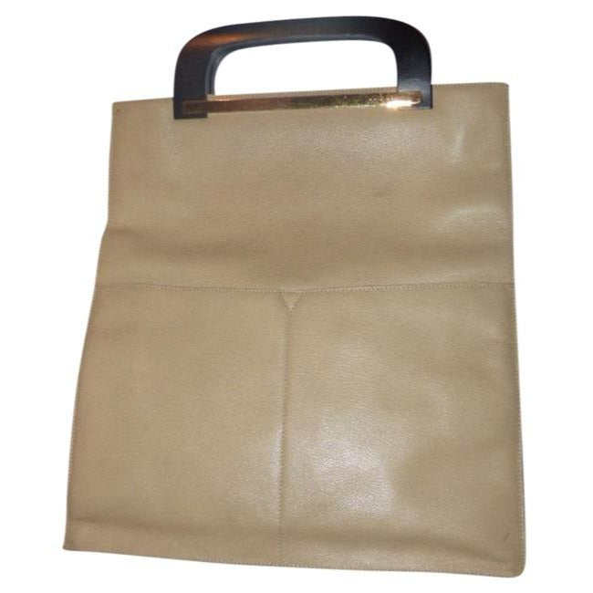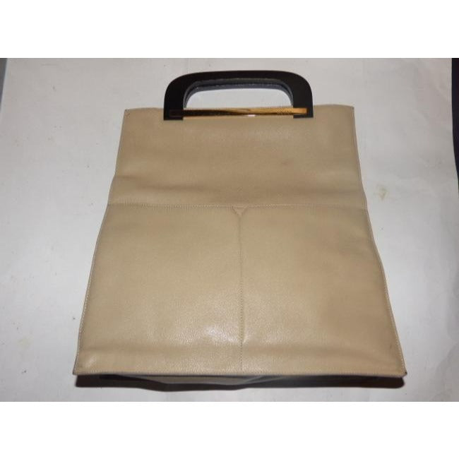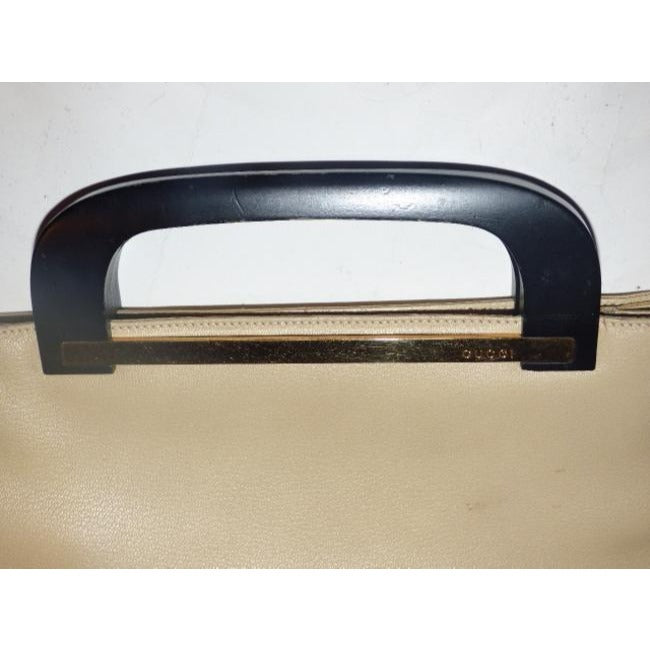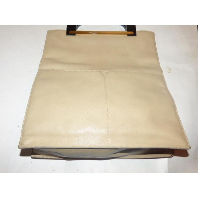 For sale is a vintage, Tom Ford era, Gucci, stone colored textured leather, fold-able. chic style tote or shopper with two lacquered wood? and sleek gold accents and would be great used as your signature tote!