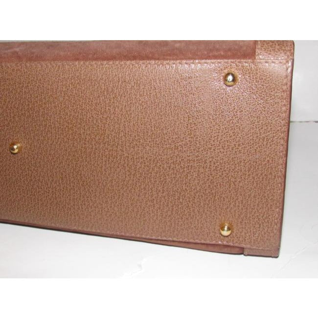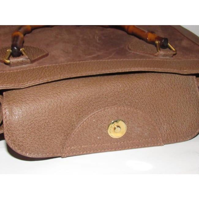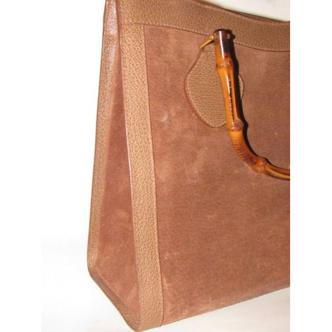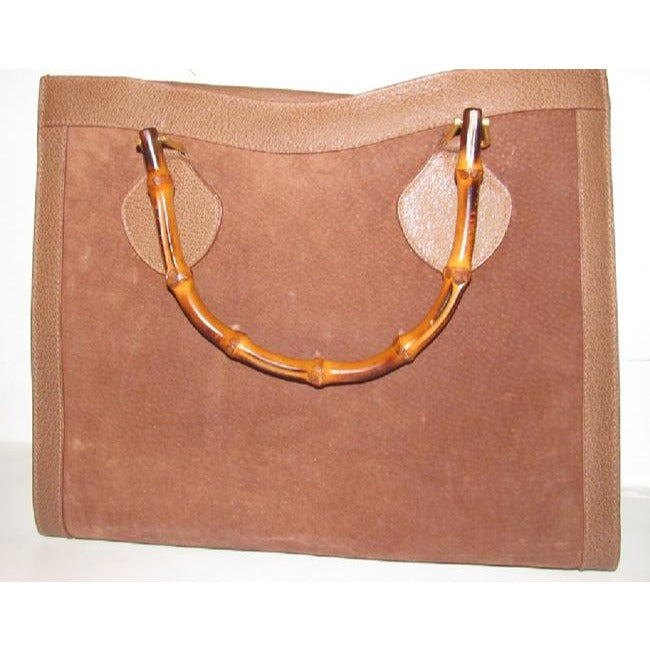 The bag is the perfect top handle tote style purse by Gucci that is so great they are still making an almost identical style for $3K! The purse is a larger size and has two bamboo handle! It is made of brown suede framed by textured leather. There are gold equestrian influenced accents that attach the bamboo handles and it has a footed bottom. It has the true 1960's Gucci mod look that is always in style!