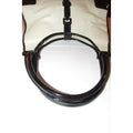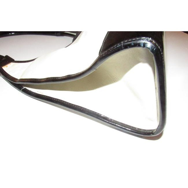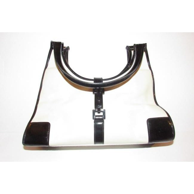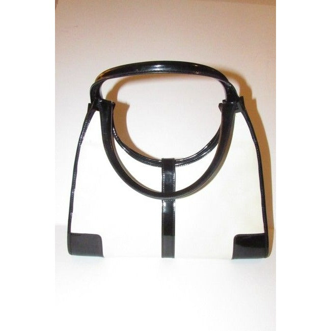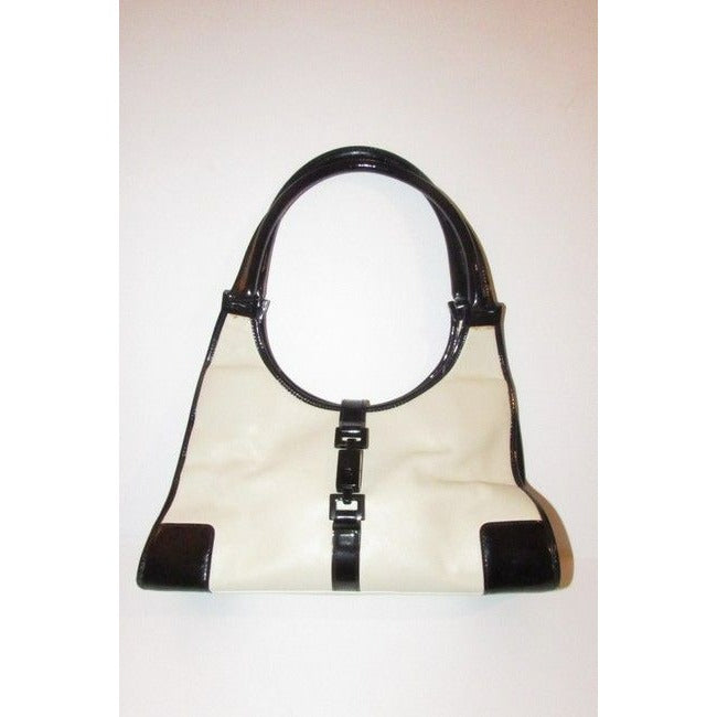 The bag is the perfect Jackie- O version by Gucci that no one else will have! The purse is a rare, color block style in a white leather and black patent leather version! It is an open top style with two black patent leather handles that is attached to a black enamel, push button clasp closure! It has the true 1960's Gucci mod look! This could be dressed up or your fun color block bag!