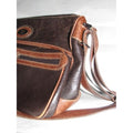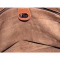 The bag is a tote or satchel style purse by GUCCI. It is made from brown leather in two shades and textures. There is contrast stitching in ivory. It has equestrian accents and a zip top with a wide, adjustable leather strap. The interior is made in a very clean brown suede with a large zip pocket.